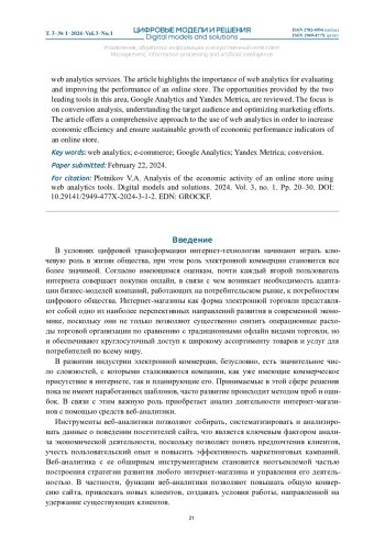 Современный рынок электронной коммерции представляет собой экономическую среду с высоким уровнем конкуренции, поэтому достижение коммерческого успеха на нем во многом зависит от способности торговых организаций анализировать и оптимизировать свою деятельность на основе данных, представляемых сервисами веб-аналитики. В статье освещается значимость веб-аналитики для оценки и улучшения работы интернет-магазина. Рассматриваются возможности, предоставляемые двумя ведущими инструментами в этой области: Google Analytics и «Яндекс Метрика». Основное внимание уделено анализу конверсии, пониманию целевой аудитории и оптимизации маркетинговых усилий. В статье предлагается комплексный подход к использованию веб-аналитики для повышения экономической эффективности и обеспечения устойчивого роста показателей экономической деятельности интернет-магазина
