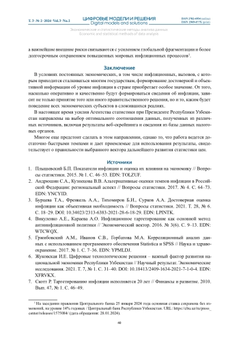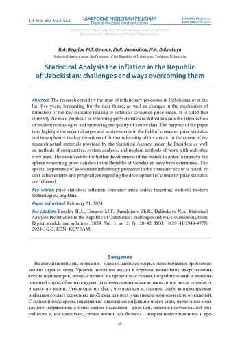 В статье рассматривается состояние инфляционных процессов в Узбекистане на протяжении пяти последних лет, прогнозирование на ближайшую перспективу, а также изменения механизма формирования ключевого показателя инфляции – индекса потребительских цен. Отмечается, что в настоящее время основной акцент при реформировании статистики цен смещен в сторону внедрения современных технологий и повышения качества исходных данных. Цель статьи – осветить последние изменения и достижения в области статистики потребительских цен и выделить ключевые направления дальнейшего реформирования данной сферы. При проведении исследования были использованы актуальные материалы Агентства статистики при Президенте Республики Узбекистан, методы сравнительного, системного анализа, а также современные методы работы с веб-сайтами. Определены основные векторы дальнейшего развития отрасли с целью совершенствования сферы статистики цен в Республике Узбекистан. Отмечена особая важность оценки инфляционных процессов в потребительском секторе, отражены последние достижения и перспективы развития статистики потребительских цен