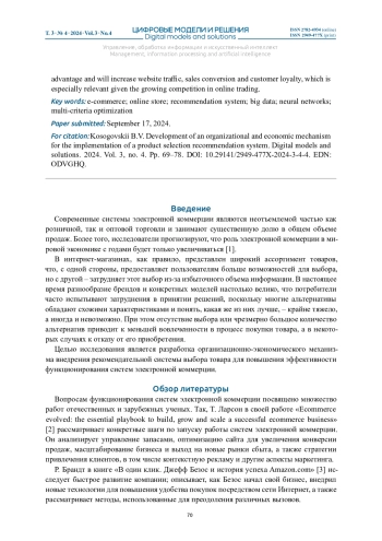 Исследование включает анализ существующих проблем, которые возникают в процессе выбора товара, в том числе сложных технических устройств. На основе проведенного анализа в статье предлагается организационно-экономический механизм, позволяющий внедрить в деятельность интернет-магазина рекомендательную систему, которая дает возможность упростить процесс выбора товара для пользователя. Данный инструмент предоставит организации конкурентное преимущество и позволит повысить посещаемость сайта, конверсию продаж и лояльность покупателей, что особенно актуально с учетом растущей конкуренции в онлайн-торговле