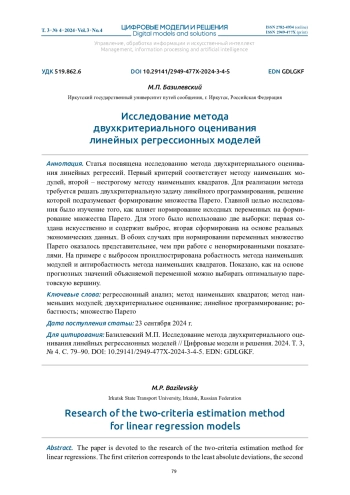 Статья посвящена исследованию метода двухкритериального оценивания линейных регрессий. Первый критерий соответствует методу наименьших модулей, второй – нестрогому методу наименьших квадратов. Для реализации метода требуется решать двухкритериальную задачу линейного программирования, решение которой подразумевает формирование множества Парето. Главной целью исследования было изучение того, как влияет нормирование исходных переменных на формирование множества Парето. Для этого было использовано две выборки: первая создана искусственно и содержит выброс, вторая сформирована на основе реальных экономических данных. В обоих случаях при нормировании переменных множество Парето оказалось представительнее, чем при работе с ненормированными показателями. На примере с выбросом проиллюстрирована робастность метода наименьших модулей и антиробастность метода наименьших квадратов. Показано, как на основе прогнозных значений объясняемой переменной можно выбирать оптимальную паретовскую вершину.