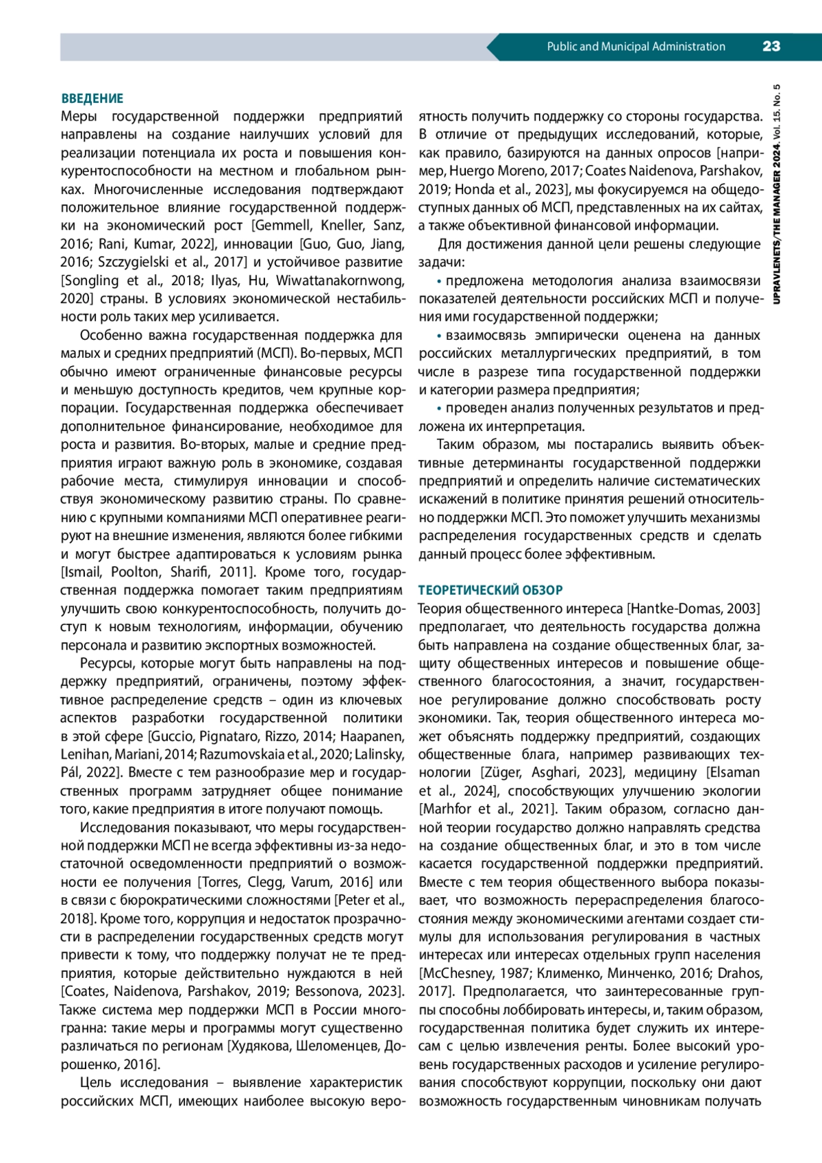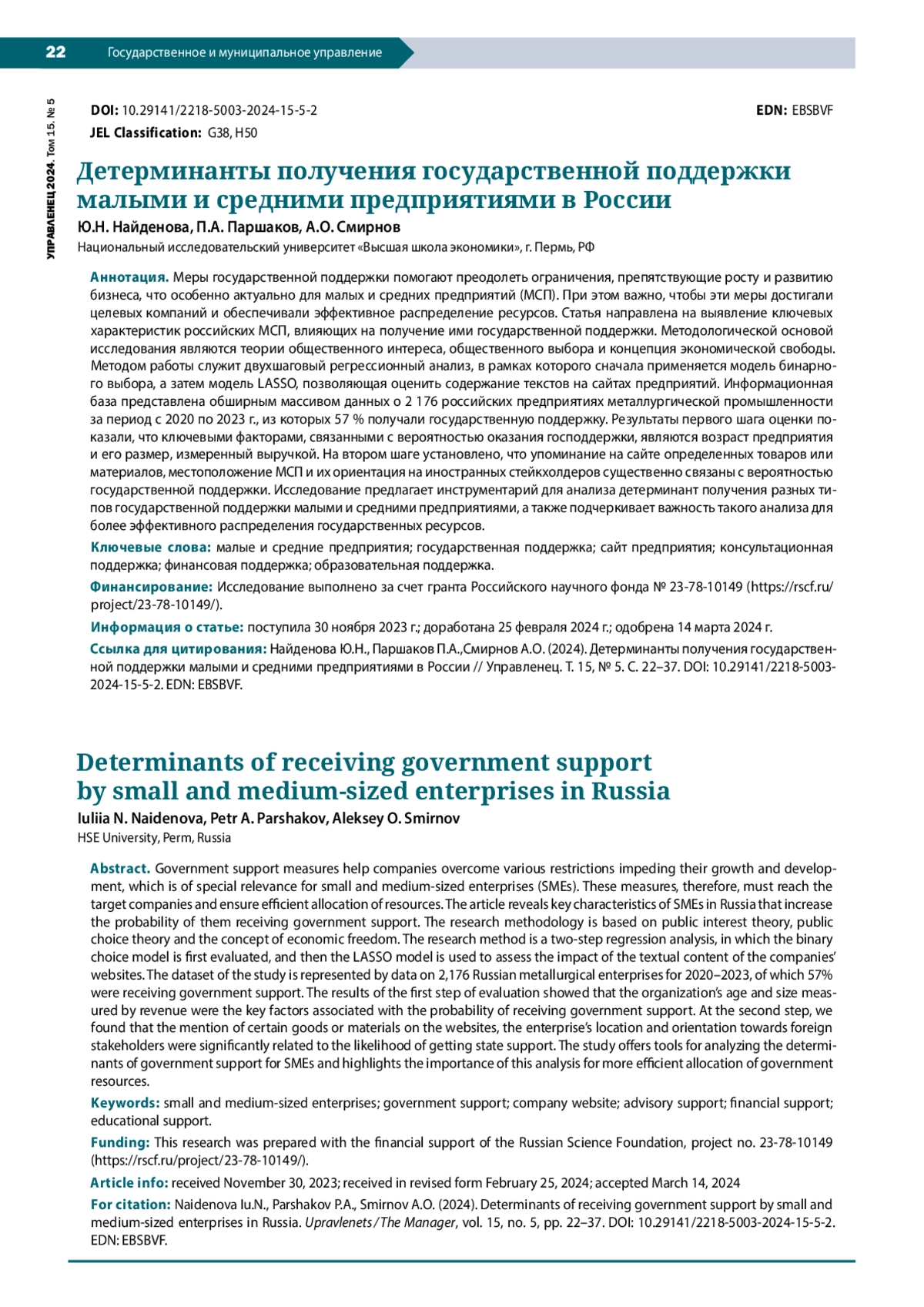 Меры государственной поддержки помогают преодолеть ограничения, препятствующие росту и развитию бизнеса, что особенно актуально для малых и средних предприятий (МСП). При этом важно, чтобы эти меры достигали целевых компаний и обеспечивали эффективное распределение ресурсов. Статья направлена на выявление ключевых характеристик российских МСП, влияющих на получение ими государственной поддержки. Методологической основой исследования являются теории общественного интереса, общественного выбора и концепция экономической свободы. Методом работы служит двухшаговый регрессионный анализ, в рамках которого сначала применяется модель бинарного выбора, а затем модель LASSO, позволяющая оценить содержание текстов на сайтах предприятий. Информационная база представлена обширным массивом данных о 2 176 российских предприятиях металлургической промышленности за период с 2020 по 2023 г., из которых 57 % получали государственную поддержку. Результаты первого шага оценки показали, что ключевыми факторами, связанными с вероятностью оказания господдержки, являются возраст предприятия и его размер, измеренный выручкой. На втором шаге установлено, что упоминание на сайте определенных товаров или материалов, местоположение МСП и их ориентация на иностранных стейкхолдеров существенно связаны с вероятностью государственной поддержки. Исследование предлагает инструментарий для анализа детерминант получения разных типов государственной поддержки малыми и средними предприятиями, а также подчеркивает важность такого анализа для более эффективного распределения государственных ресурсов