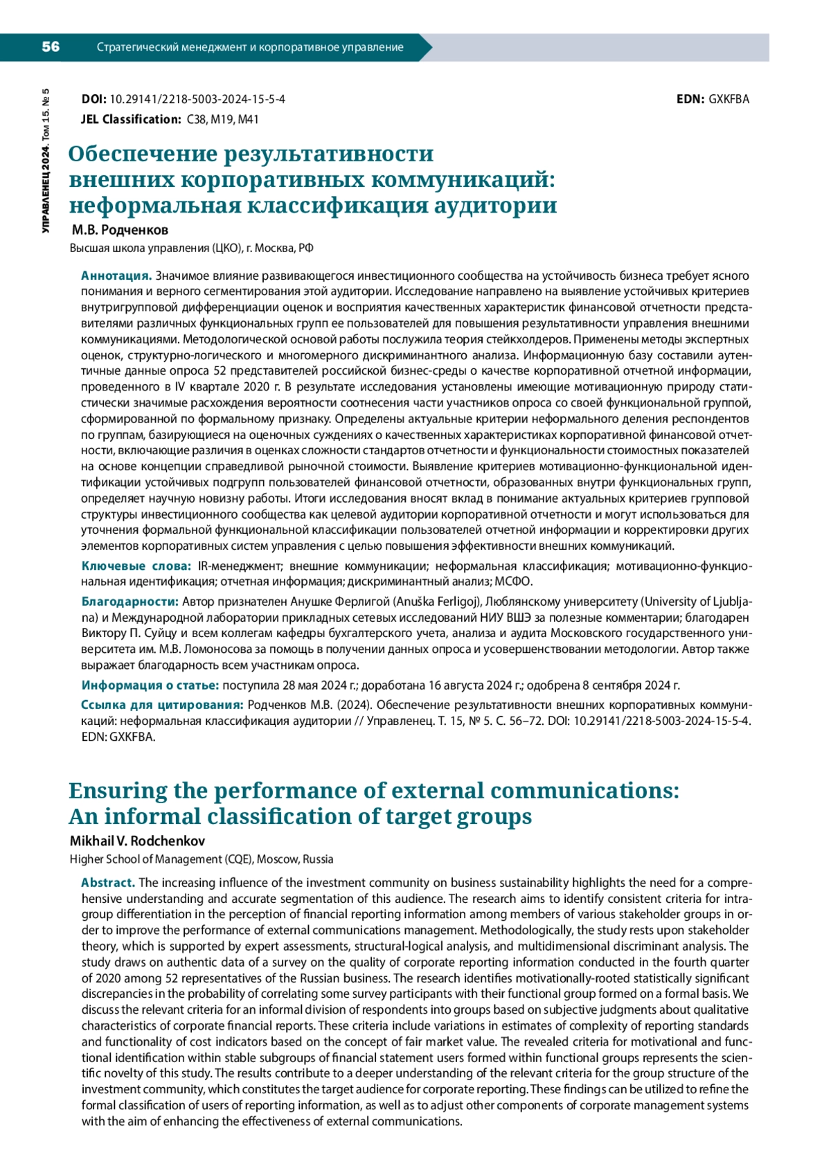 Значимое влияние развивающегося инвестиционного сообщества на устойчивость бизнеса требует ясного понимания и верного сегментирования этой аудитории. Исследование направлено на выявление устойчивых критериев внутригрупповой дифференциации оценок и восприятия качественных характеристик финансовой отчетности представителями различных функциональных групп ее пользователей для повышения результативности управления внешними коммуникациями. Методологической основой работы послужила теория стейкхолдеров. Применены методы экспертных оценок, структурно-логического и многомерного дискриминантного анализа. Информационную базу составили аутентичные данные опроса 52 представителей российской бизнес-среды о качестве корпоративной отчетной информации, проведенного в IV квартале 2020 г. В результате исследования установлены имеющие мотивационную природу статистически значимые расхождения вероятности соотнесения части участников опроса со своей функциональной группой, сформированной по формальному признаку. Определены актуальные критерии неформального деления респондентов по группам, базирующиеся на оценочных суждениях о качественных характеристиках корпоративной финансовой отчетности, включающие различия в оценках сложности стандартов отчетности и функциональности стоимостных показателей на основе концепции справедливой рыночной стоимости. Выявление критериев мотивационно-функциональной идентификации устойчивых подгрупп пользователей финансовой отчетности, образованных внутри функциональных групп, определяет научную новизну работы. Итоги исследования вносят вклад в понимание актуальных критериев групповой структуры инвестиционного сообщества как целевой аудитории корпоративной отчетности и могут использоваться для уточнения формальной функциональной классификации пользователей отчетной информации и корректировки других элементов корпоративных систем управления с целью повышения эффективности внешних коммуникаций
