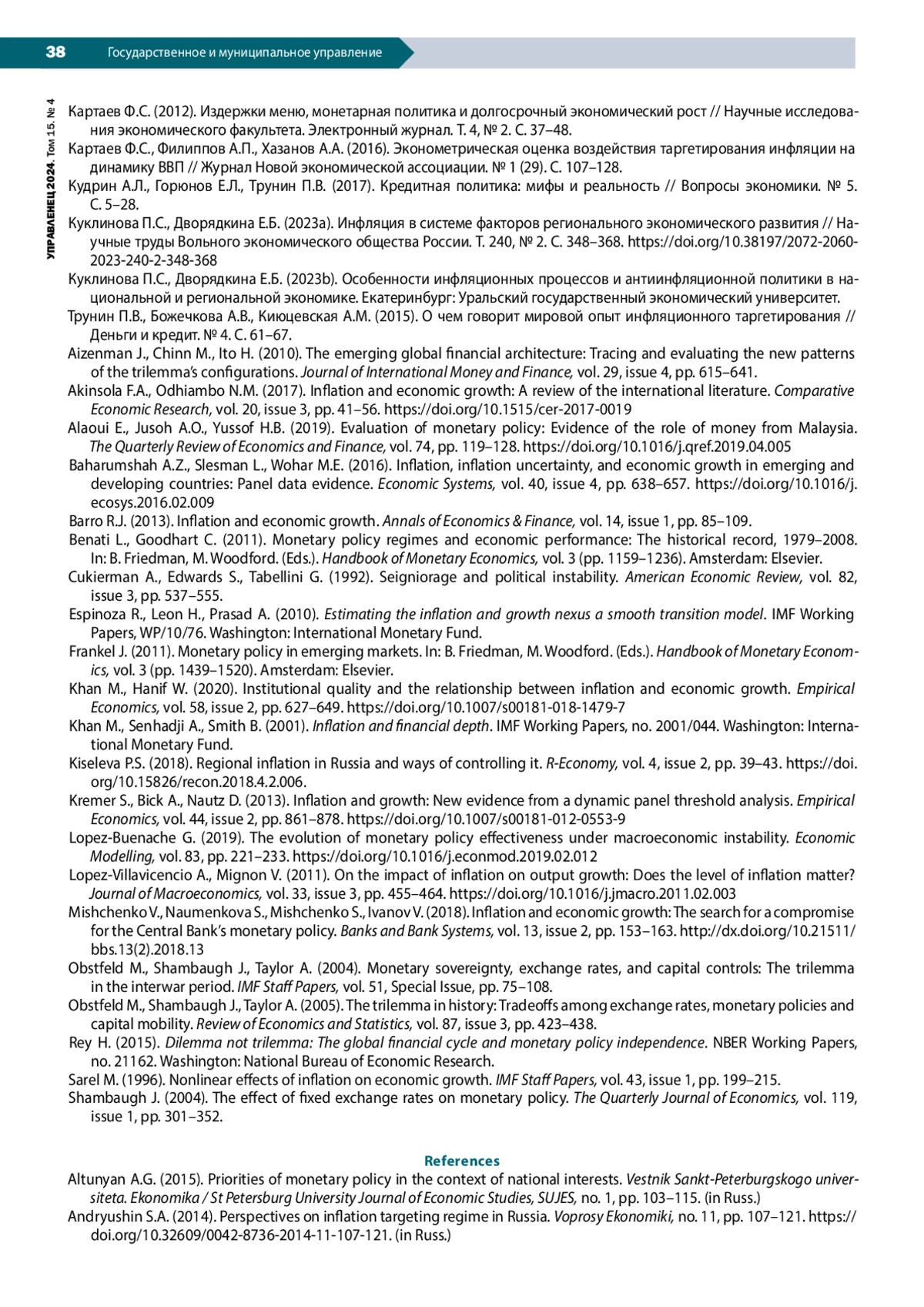 1. Алтунян А.Г. (2015). Приоритеты монетарной политики в контексте национальных интересов // Вестник Санкт-Петербургского университета. Экономика. № 1. С. 103-115. EDN: TSVRQN