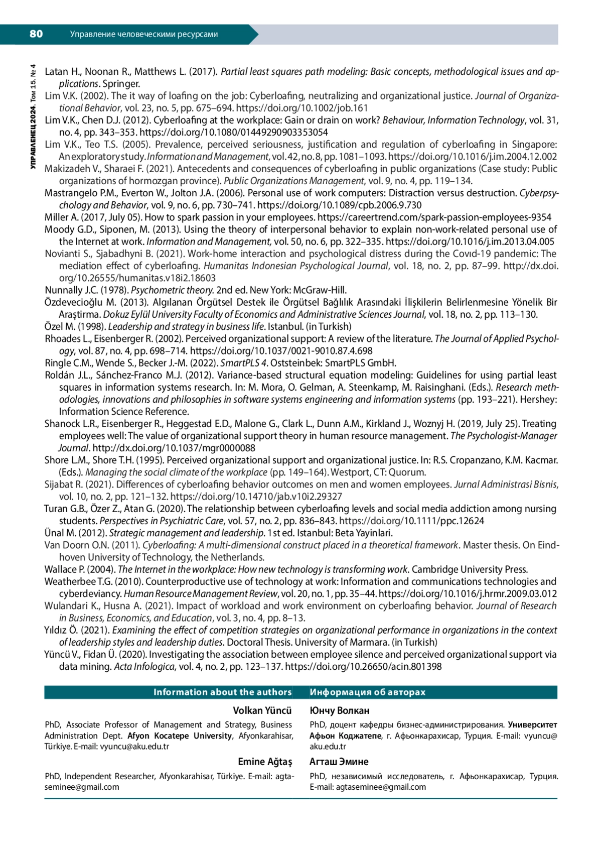 36. Lim V.K. (2002). The it way of loafing on the job: Cyberloafing, neutralizing and organizational justice. Journal of Organizational Behavior, vol. 23, no. 5, pp. 675-694. DOI: 10.1002/job.161 EDN: DVUCUL
