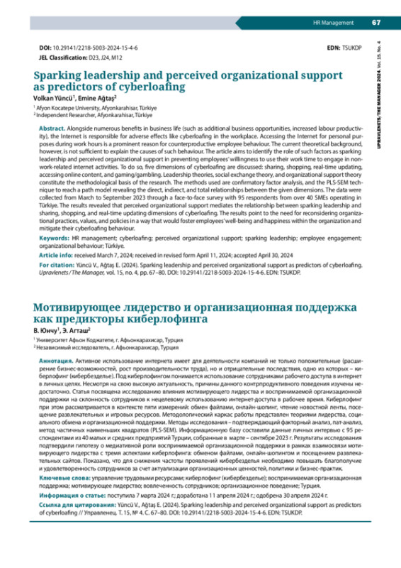 Alongside numerous benefits in business life (such as additional business opportunities, increased labour productivity), the Internet is responsible for adverse effects like cyberloafing in the workplace. Accessing the Internet for personal purposes during work hours is a prominent reason for counterproductive employee behaviour. The current theoretical background, however, is not sufficient to explain the causes of such behaviour. The article aims to identify the role of such factors as sparking leadership and perceived organizational support in preventing employees’ willingness to use their work time to engage in nonwork-related internet activities. To do so, five dimensions of cyberloafing are discussed: sharing, shopping, real-time updating, accessing online content, and gaming/gambling. Leadership theories, social exchange theory, and organizational support theory constitute the methodological basis of the research. The methods used are confirmatory factor analysis, and the PLS-SEM technique to reach a path model revealing the direct, indirect, and total relationships between the given dimensions. The data were collected from March to September 2023 through a face-to-face survey with 95 respondents from over 40 SMEs operating in Türkiye. The results revealed that perceived organizational support mediates the relationship between sparking leadership and sharing, shopping, and real-time updating dimensions of cyberloafing. The results point to the need for reconsidering organizational practices, values, and policies in a way that would foster employees’ well-being and happiness within the organization and mitigate their cyberloafing behaviour