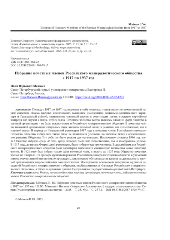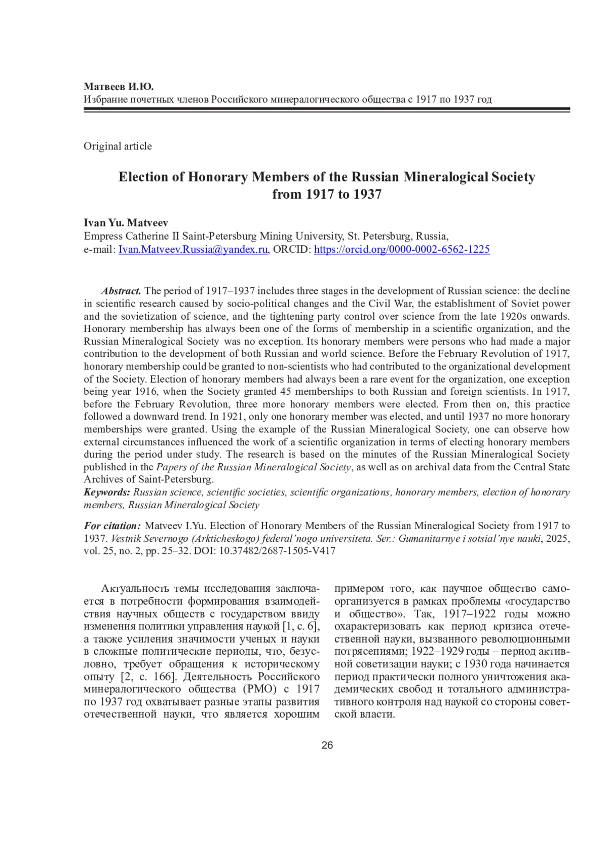 Период с 1917 по 1937 год включает в себя несколько этапов развития отечественной науки: снижение объема научных исследований, вызванное изменениями социально-политического характера и Гражданской войной; становление советской власти и советизация науки; усиление партийного контроля над наукой с конца 1920-х годов. Почетное членство всегда являлось одной из форм членства в научной организации - не было исключением и Российское минералогическое общество. В почетные члены названной организации избирались лица, внесшие большой вклад в развитие как отечественной, так и мировой науки. В период до Февральской революции 1917 года в почетные члены Российского минералогического общества избирались также лица, не являвшиеся учеными, но внесшие вклад в организационное развитие Общества. Это событие было редким для организации. Исключение составил 1916 год, когда Общество избрало сразу 45 чел., среди которых были как отечественные, так и иностранные ученые. В 1917 году, до начала Февральской революции, было избрано еще три человека. В дальнейшем для Российского минералогического общества была характерна тенденция к уменьшению количества новых почетных членов. В 1921 году был избран только один почетный член, и вплоть до 1937 года Общество почетных членов не избирало. На примере функционирования Российского минералогического общества в указанный период отечественной науки можно проследить, как внешние обстоятельства влияли на деятельность научной организации в вопросе избрания почетных членов. Исследование основано на материалах журналов заседаний Российского минералогического общества, опубликованных в «Записках Российского минералогического общества», а также на архивных данных Центрального государственного архива Санкт-Петербурга.