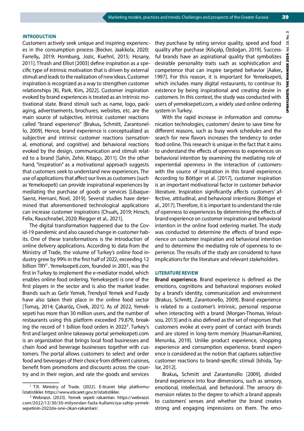 The introduction of new technologies provides consumers with additional shopping opportunities and allow them to test new products. The study was conducted to determine the effects of brand experience on customer inspiration and behavioral intention and to establish the mediating role of openness to experience. The theoretical framework of the study resides in the theory of marketing and cognitive appraisal theory. Convenience sampling method and structural equation modelling were used within the study. The population of the study consists of customers who order from the online takeaway portal yemeksepeti. com. The data were gathered using questionnaires collected online in June, 2023. A total of 416 valid responses were received. Smart PLS 4 statistical program was used to test the hypotheses. As a result of the tests, it was found that brand experience has a positive effect on customer inspiration and openness to experience. It was also determined that openness to experience has a positive effect on customer inspiration by partially mediating the positive effect between brand experience and inspiration. Furthermore, the hypothesis that customer inspiration positively affects behavioral intention was also confirmed. The research will contribute to expanding the literature on consumer inspiration and openness to experience. Among possible directions for further research is to test the proposed model in relating industries or using statistical data from other countries