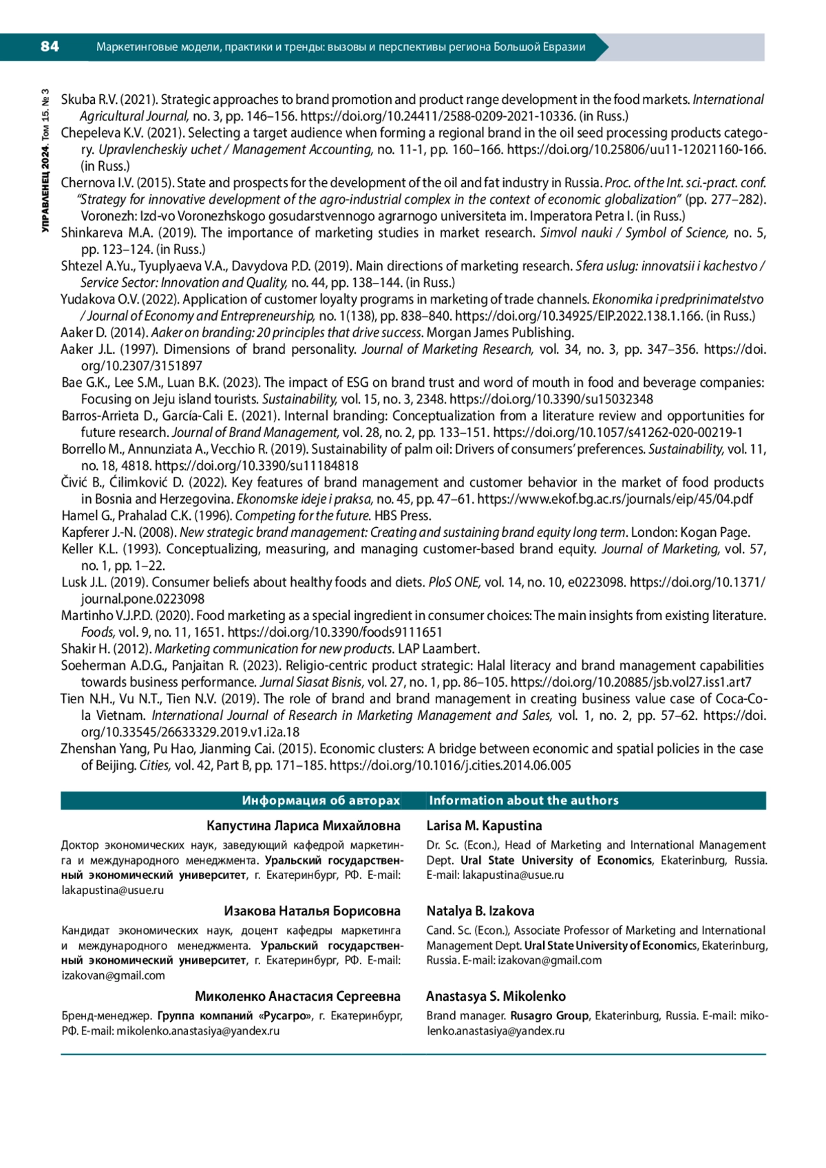 6. Капустина Л.М., Миколенко А.С., Сысоева Т.Л. (2022). Бренд-менеджмент на рынке продовольственных товаров // Вестник Академии знаний. № 53 (6). С. 421-424. EDN: NRPDRG
