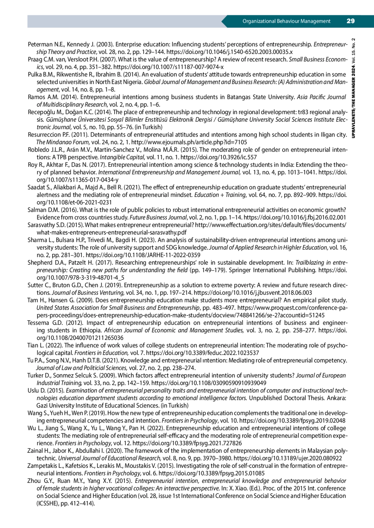 24. Fidan Y., Çetin S., Yurdasever E. (2021). Change of entrepreneurial thought in undergraduate business students comparison of 2005 and 2020. Itobiad: Journal of the Human & Social Science Researches, vol. 10, no. 1. (In Turkish). DOI: 10.15869/itobiad.746379