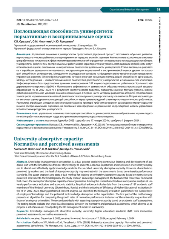 Управление знаниями в университетах представляет двуединый процесс: постоянное обучение, развитие научно-педагогических работников и одновременная передача знаний студентам. Коллективные возможности и мотивация работников к усвоению и эффективному применению знаний определяют так называемую поглощающую способность университета. Вместе с тем воспринимаемые работниками характеристики и уровень поглощающей способности могут отличаться от оценок, основанных на нормативных показателях деятельности университета. Статья посвящена разработке и апробации двуединого методического инструментария нормативной и воспринимаемой оценок уровня поглощающей способности университета. Методология исследования основана на фундаментально-теоретическом направлении управления знаниями (knowledge management), которое включает концепцию поглощающей способности организации. Методы исследования – компаративный анализ показателей деятельности университетов и экономическая статистика. Информационная база представлена данными анкетирования 187 научно-педагогических работников Уральского федерального университета (УрФУ) и Мониторинга эффективности деятельности образовательных организаций высшего образования РФ за 2022–2023 гг. В результате контент-анализа выделены параметры оценки: текущий уровень знаний работников и потенциал усвоения знаний в организации. В первой части методики разработан алгоритм сопоставления темпов роста нормативных показателей деятельности исследуемого университета и вузов-аналогов. Вторая часть методики включает оценку уровня поглощающей способности через призму суждений о нем научно-педагогических работников. Результаты апробации методического инструментария на примере УрФУ иллюстрируют расхождение между нормативными и воспринимаемыми оценками, на основании чего предложены решения по корректировке модели управления человеческими ресурсами университета