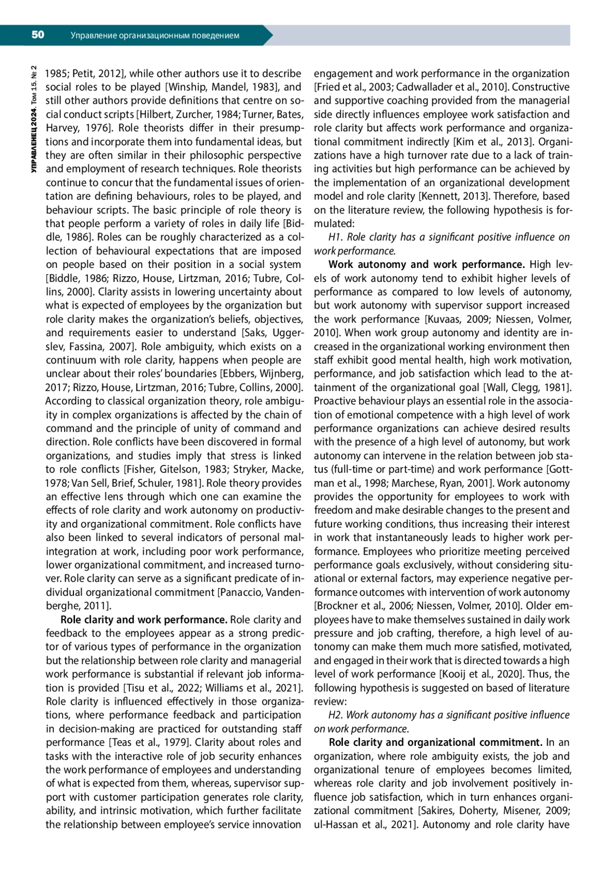 In the context of globalization, work autonomy as well as an individual global mindset helps employees seek competitive advantage, thereby enhancing work performance and innovative work behaviour [Correia et al., 2023; Pusparini, Aryasa, 2021; van Zyl et al., 2021]. Employees who believe that the outcome is the product of their actions and have good relationships with their leaders are seen to have a considerably greater level of role clarity, which has a substantial influence on work performance and commitment than those who lack all of these aspects [Hegazy et al., 2023; Kauppila, 2014].