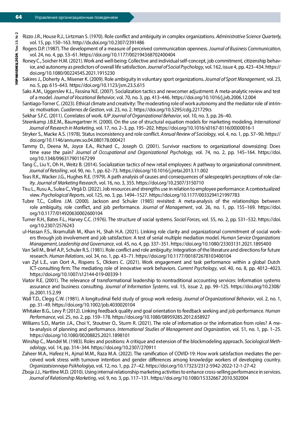 87. Van Sell M., Brief A.P., Schuler R.S. (1981). Role conflict and role ambiguity: Integration of the literature and directions for future research. Human Relations, vol. 34, no. 1, pp. 43-71. DOI: 10.1177/001872678103400104 EDN: JMJJYB