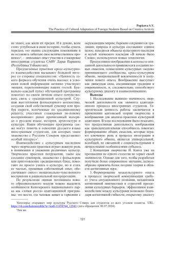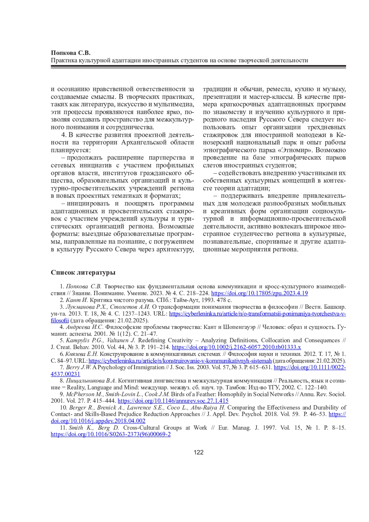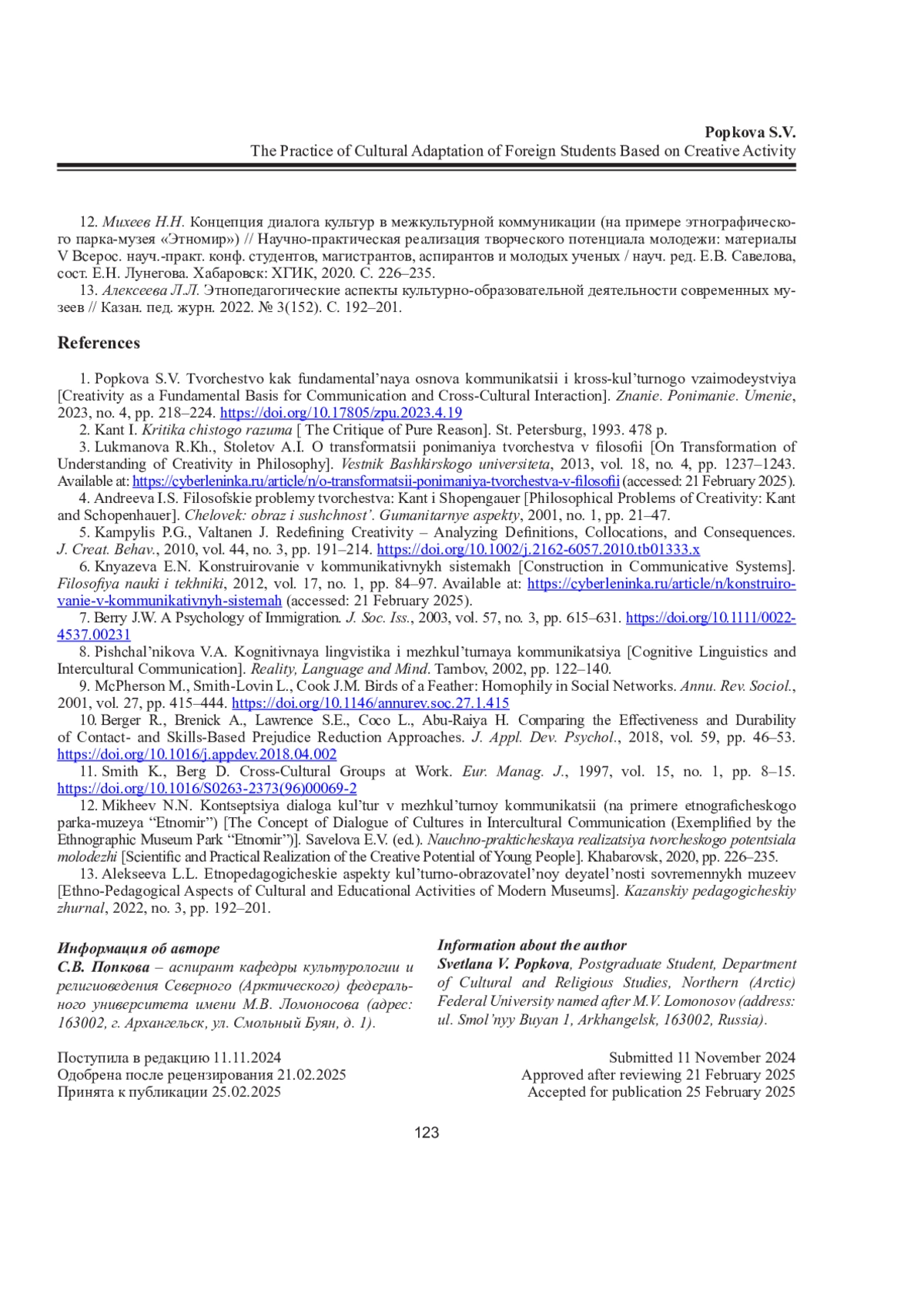 1. Попкова С.В. Творчество как фундаментальная основа коммуникации и кросс-культурного взаимодействия // Знание. Понимание. Умение. 2023. No 4. С. 218-224. DOI: 10.17805/zpu.2023.4.19