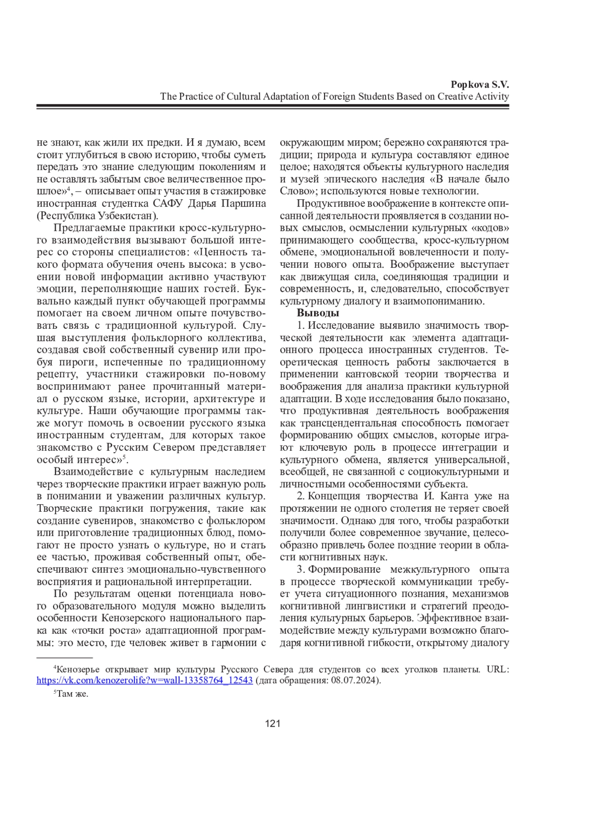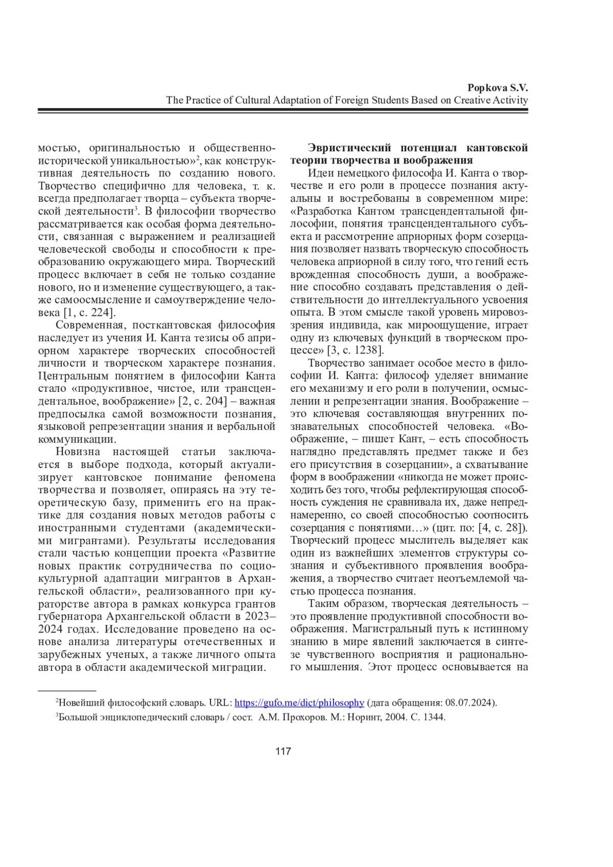В статье поставлена цель продемонстрировать роль творческой деятельности в процессе адаптации иностранных студентов к другой культуре. Анализ строится вокруг понятия продуктивной способности воображения И. Канта. Установлено, что творчество выступает фундаментальной основой коммуникации, а продуктивная способность воображения - неотъемлемой частью процесса коммуникации. Творчество понимается как коллективный процесс коммуникации, способствующий формированию общего для представителей разных культур опыта. Автор акцентирует внимание на значимости применения современных когнитивных теорий, включая концепцию ситуационного познания и когнитивную лингвистику, предоставляющие эффективные модели для объяснения процесса формирования межкультурного опыта в условиях творческой коммуникации. В качестве примера, в котором совместные творческие практики студентов из разных стран приводят к успешному межкультурному взаимодействию и адаптации к другой культуре, приведен опыт работы Кенозерского национального парка (Архангельская область) и этнографического парка «Этномир» (Калужская область). В заключение сделан вывод, что продуктивная способность воображения обусловливает создание общих смыслов, обеспечивающих диалог культур, и обозначены перспективы дальнейшей реализации заявленного взаимодействия. Теоретическая значимость статьи заключается в том, что показан эвристический потенциал кантовской теории творчества и воображения в исследовании практики культурной адаптации иностранных студентов. Практическая значимость состоит в том, что обозначены перспективы дальнейшей разработки проекта «Развитие новых практик сотрудничества по социокультурной адаптации мигрантов в Архангельской области», который был реализован в рамках конкурса грантов губернатора Архангельской области в 2023-2024 годах.