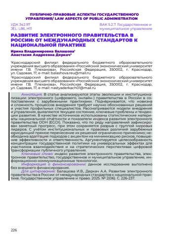 БАЛАШОВА И. В., ДЕРКАЧ А. А. РАЗВИТИЕ ЭЛЕКТРОННОГО ПРАВИТЕЛЬСТВА В РОССИИ: ОТ МЕЖДУНАРОДНЫХ СТАНДАРТОВ К НАЦИОНАЛЬНОЙ ПРАКТИКЕ // НАУЧНЫЙ ЖУРНАЛ "ГОСУДАРСТВЕННОЕ УПРАВЛЕНИЕ И ПРАВО". 2025. № 2 (6)