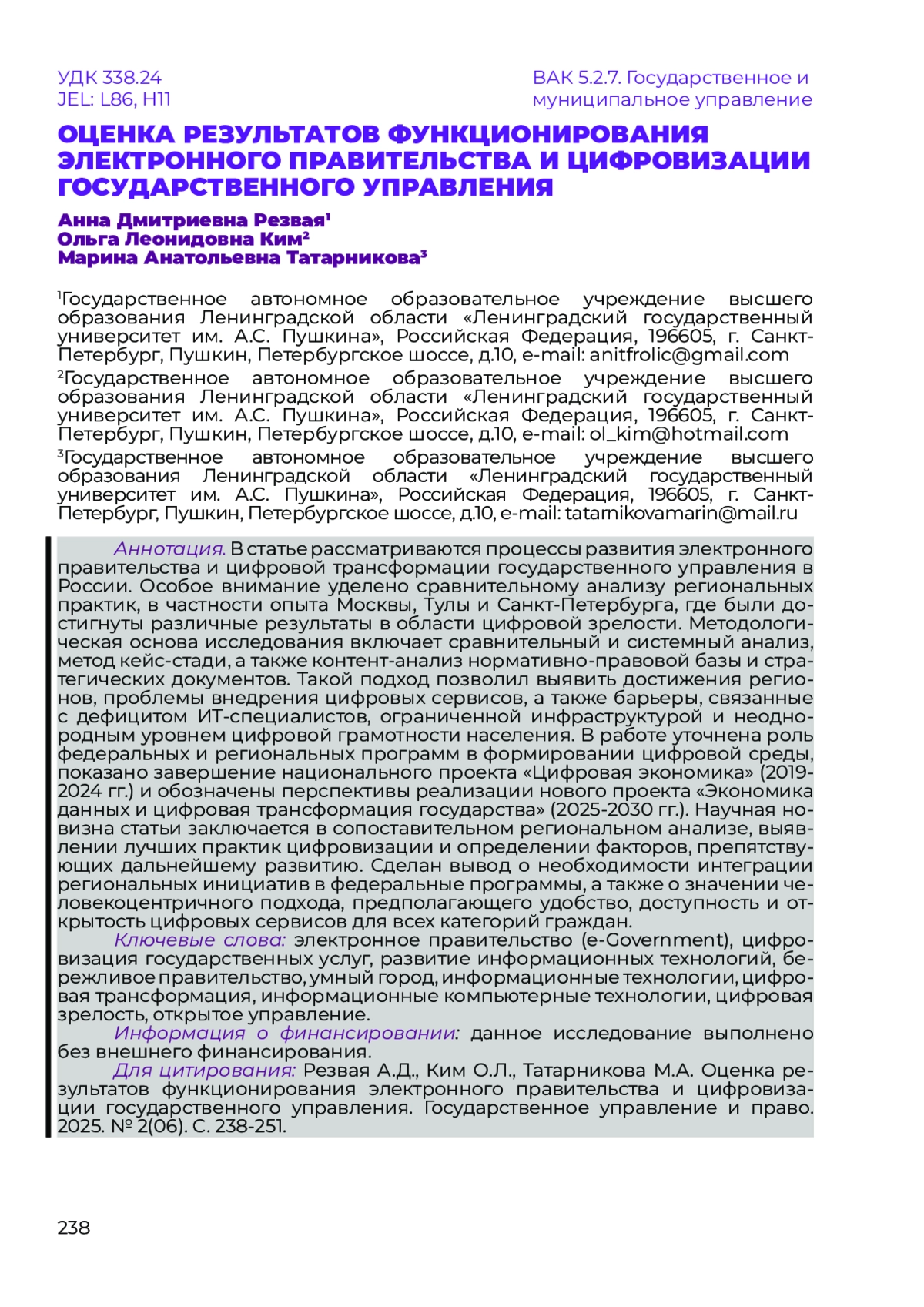 16. Киносян К.Р., Татарникова М.А. Цифровая трансформация государственного управления // Галактика науки - 2023: Всероссийская научно-практическая конференция с международным участием, Краснодар, 19-22 апреля 2023 года. Том 1. Краснодар: Кубанский государственный университет, 2023. С. 289-294. EDN: XBPIUS