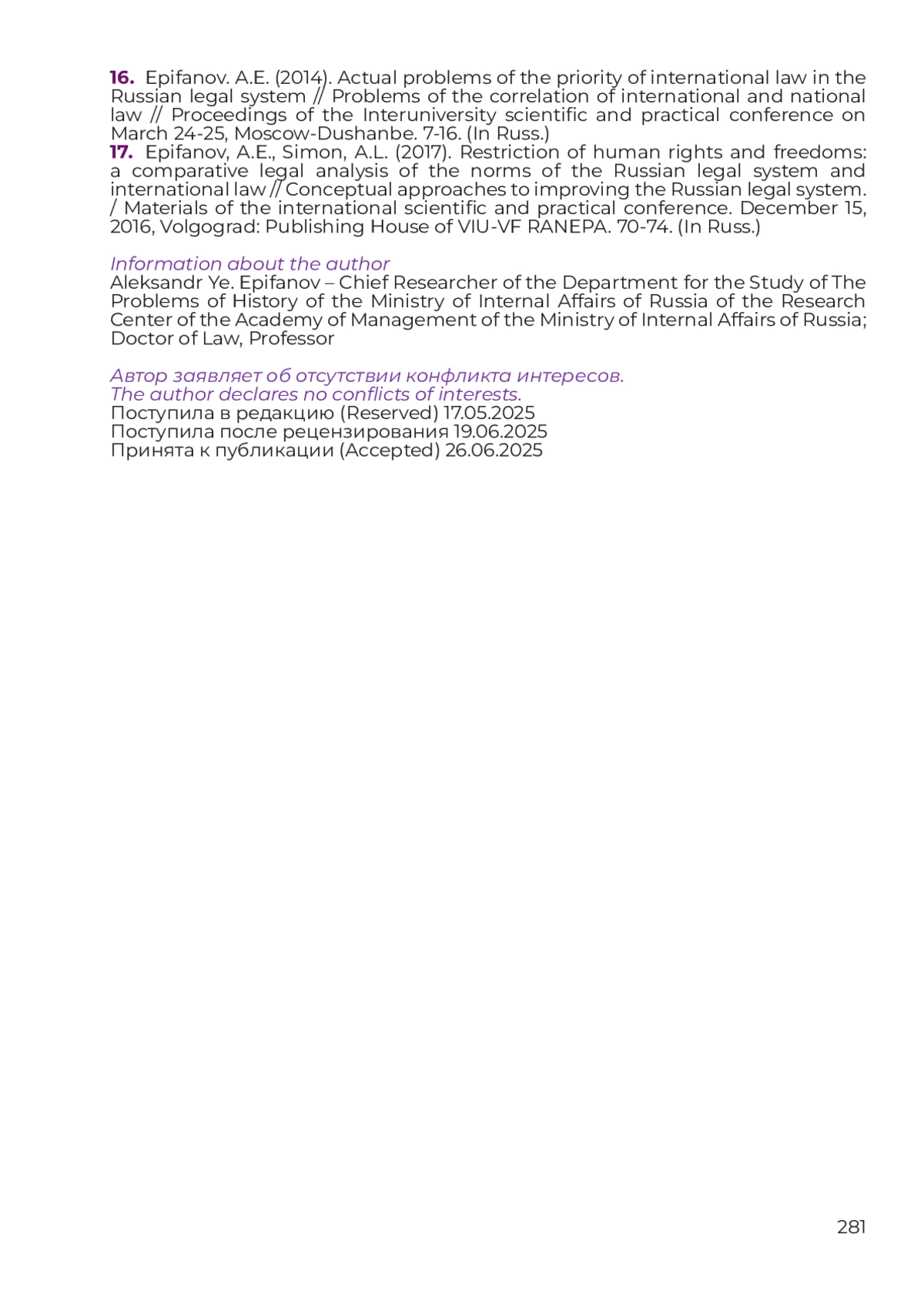 17. Епифанов А.Е., Симон А.Л. Ограничение прав и свобод человека: сравнительно-правовой анализ норм российской правовой системы и международного права // Концептуальные подходы к совершенствованию российской правовой системы: материалы международной научно-практической конференции. 15 декабря 2016 г. Волгоград: Изд-во ВИУ-ВФ РАНХиГС, 2017. С. 70-74.
