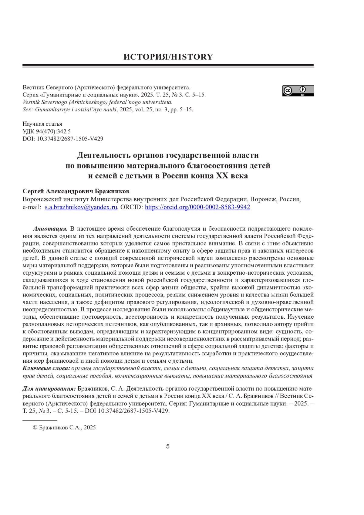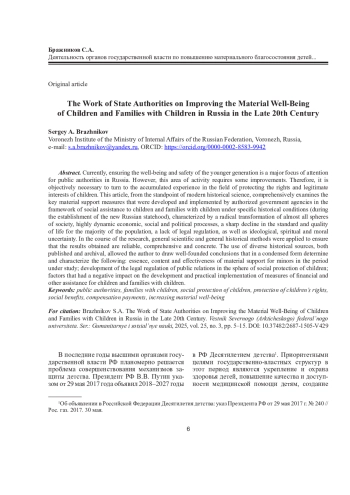 В настоящее время обеспечение благополучия и безопасности подрастающего поколения является одним из тех направлений деятельности системы государственной власти Российской Федерации, совершенствованию которых уделяется самое пристальное внимание. В связи с этим объективно необходимым становится обращение к накопленному опыту в сфере защиты прав и законных интересов детей. В данной статье с позиций современной исторической науки комплексно рассмотрены основные меры материальной поддержки, которые были подготовлены и реализованы уполномоченными властными структурами в рамках социальной помощи детям и семьям с детьми в конкретно-исторических условиях, складывавшихся в ходе становления новой российской государственности и характеризовавшихся глобальной трансформацией практически всех сфер жизни общества, крайне высокой динамичностью экономических, социальных, политических процессов, резким снижением уровня и качества жизни большей части населения, а также дефицитом правового регулирования, идеологической и духовно-нравственной неопределенностью. В процессе исследования были использованы общенаучные и общеисторические методы, обеспечившие достоверность, всесторонность и конкретность полученных результатов. Изучение разноплановых исторических источников, как опубликованных, так и архивных, позволило автору прийти к обоснованным выводам, определяющим и характеризующим в концентрированном виде: сущность, содержание и действенность материальной поддержки несовершеннолетних в рассматриваемый период; развитие правовой регламентации общественных отношений в сфере социальной защиты детства; факторы и причины, оказывавшие негативное влияние на результативность выработки и практического осуществления мер финансовой и иной помощи детям и семьям с детьми.