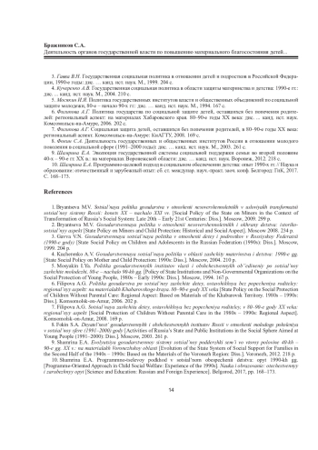 1. Брянцева М.В. Социальная политика государства в отношении несовершеннолетних в условиях трансформации социальной системы России: конец XX - начало XXI вв.: дис. … канд. ист. наук. М., 2009. 299 с. EDN: UKZSUB
