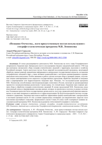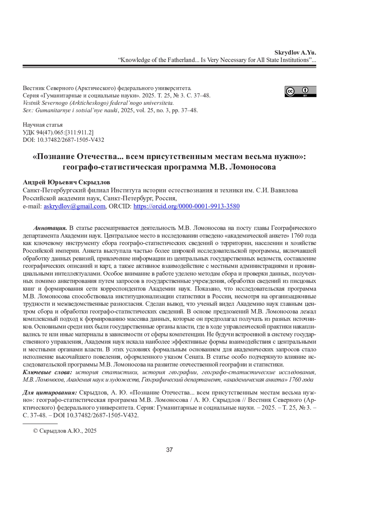 В статье рассматривается деятельность М. В. Ломоносова на посту главы Географического департамента Академии наук. Центральное место в исследовании отведено «академической анкете» 1760 года как ключевому инструменту сбора географо-статистических сведений о территории, населении и хозяйстве Российской империи. Анкета выступала частью более широкой исследовательской программы, включавшей обработку данных ревизий, привлечение информации из центральных государственных ведомств, составление географических описаний и карт, а также активное взаимодействие с местными администрациями и провинциальными интеллектуалами. Особое внимание в работе уделено методам сбора и проверки данных, полученных помимо анкетирования путем запросов в государственные учреждения, обработки сведений из писцовых книг и формирования сети корреспондентов Академии наук. Показано, что исследовательская программа М. В. Ломоносова способствовала институционализации статистики в России, несмотря на организационные трудности и межведомственные разногласия. Сделан вывод, что ученый видел Академию наук главным центром сбора и обработки географо-статистических сведений. В основе предложений М. В. Ломоносова лежал комплексный подход к формированию массива данных, которые он предполагал получать из разных источников. Основными среди них были государственные органы власти, где в ходе управленческой практики накапливались те или иные материалы в зависимости от сферы компетенции. Не будучи встроенной в систему государственного управления, Академия наук искала наиболее эффективные формы взаимодействия с центральными и местными органами власти. В этих условиях формальным основанием для академических запросов стало исполнение высочайшего повеления, оформленного указом Сената. В статье особо подчеркнуто влияние исследовательской программы М. В. Ломоносова на развитие отечественной географии и статистики.