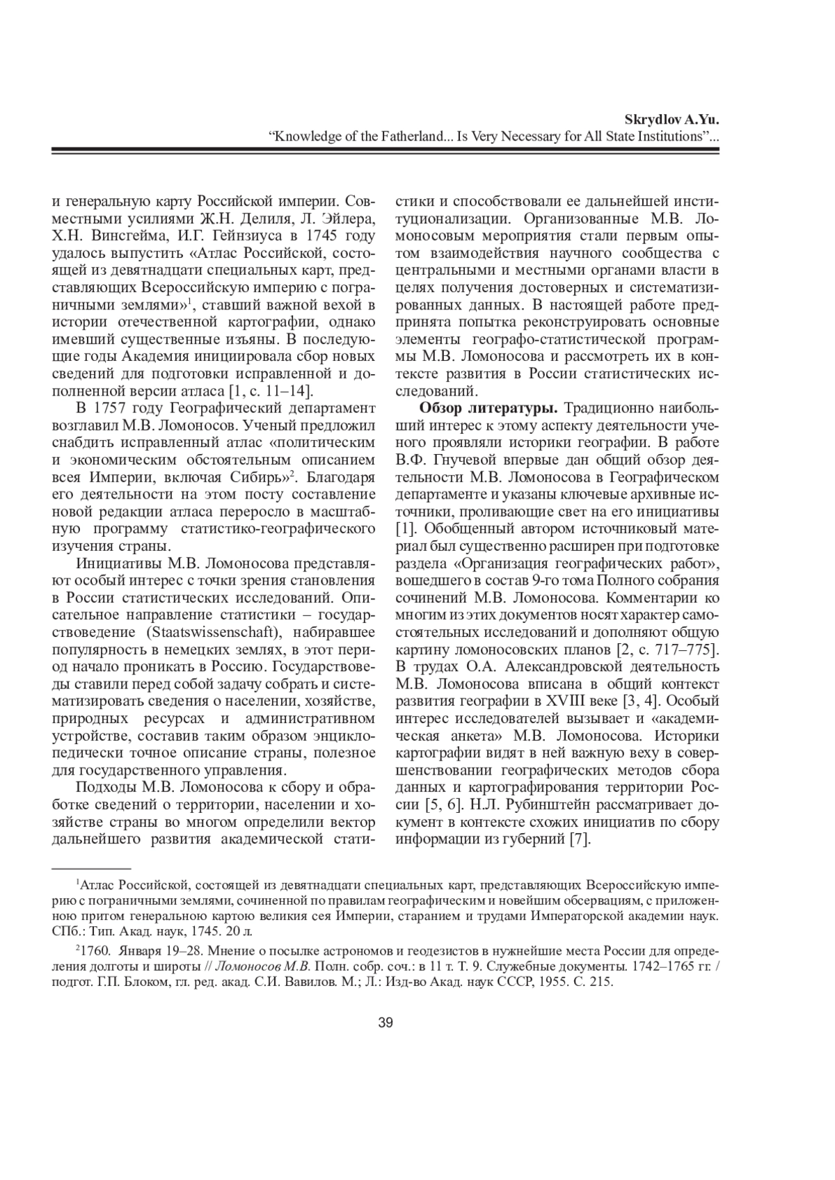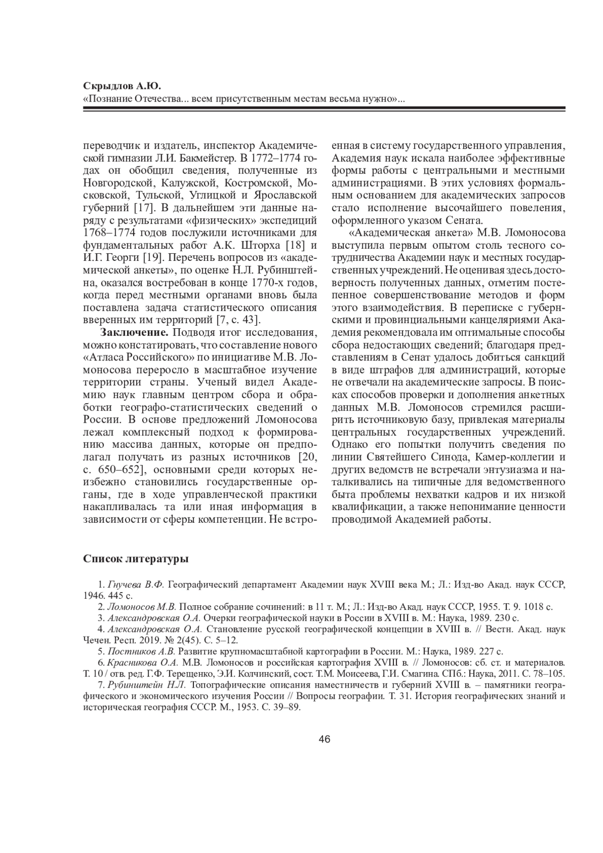 4. Александровская О.А. Становление русской географической концепции в XVIII в. // Вестн. Акад. наук Чечен. Респ. 2019. № 2(45). С. 5-12.