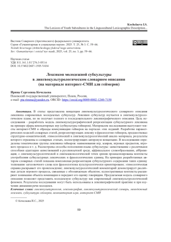 В статье представлена концепция лингвокультурологического словарного описания лексикона современных молодежных субкультур. Лексикон субкультур изучается в лингвокультурологическом плане, но не получает полного и последовательного лексикографического описания. Цель исследования - разработать модель лингвокультурографической репрезентации субкультурного лексикона на примере сферы компьютерных игр (субкультуры геймеров). Материалом исследования выступают тексты интернет-СМИ и образцы коммуникации геймеров на порталах этих изданий. Разработке параметрических моделей словарных статей, репрезентирующих лексику и фразеологию геймеров, предшествовал структурно-семантический, этимологический и лингвокультурологический анализ материала, результаты которого отражены в словарных статьях, иллюстрирующих авторскую концепцию. В исследовании определены тематические группы лексикона геймеров: наименования игр, жанров, игровых предметов, игрового процесса и т. д. Рассмотрены способы пополнения языка субкультуры: заимствование с различными способами адаптации заимствований в русскоязычной среде, аффиксальное словообразование, аббревиация; с лингвокультурологической и лингвоаксиологической точек зрения проанализированы контексты употребления субкультурных лексических и фразеологических единиц. На примерах разработанных автором словарных статей показана комплексная репрезентация субкультурного содержания таких единиц: толкование заголовочного слова или фразеологизма культурологически ориентировано; этимологическая справка раскрывает его происхождение; лингвокультурологический комментарий демонстрирует различные детали игрового процесса, связанные с обозначаемым объектом; иллюстративные контексты расширяют понимание объекта номинации и передают его оценку говорящим. Предлагаемая модель словарного описания позволяет представить молодежную субкультуру как современный лингвокультурологический феномен. Результаты исследования могут быть использованы в лексикографической практике и при изучении динамики речи молодежи.