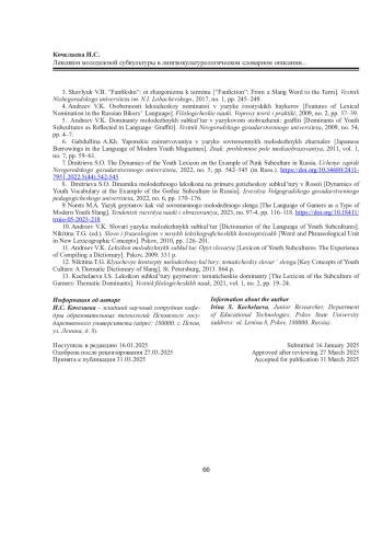 7. Дмитриева С.О. Динамика молодежного лексикона (на материале субкультуры панков) // Уч. зап. Новгор. гос. ун-та. 2022. № 5(44). С. 542-545. DOI: 10.34680/2411-7951.2022.5(44).542-545