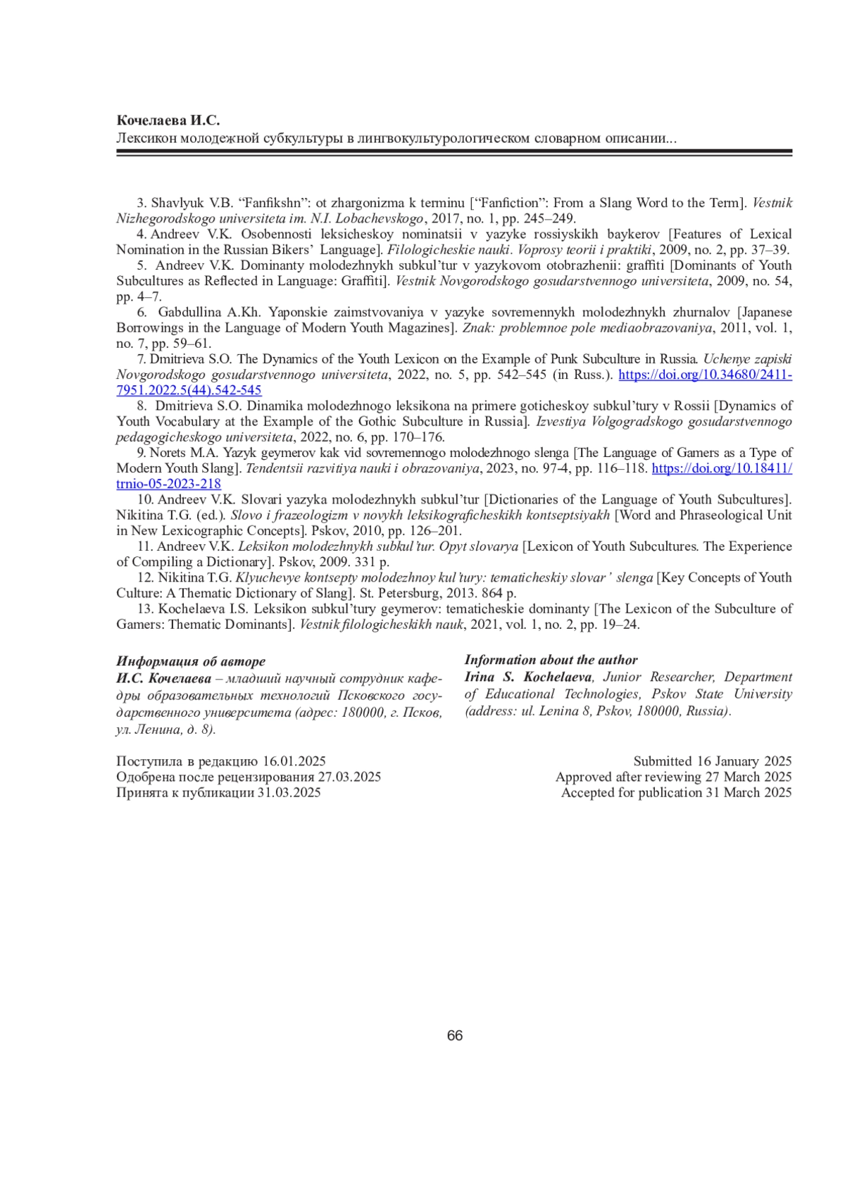 8. Дмитриева С.О. Динамика молодежного лексикона на примере готической субкультуры в России // Изв. Волгогр. гос. пед. ун-та. 2022. № 6(169). С. 170-176.