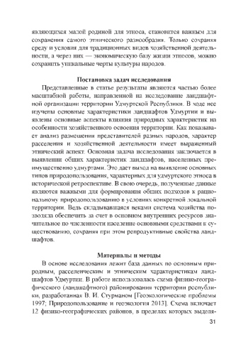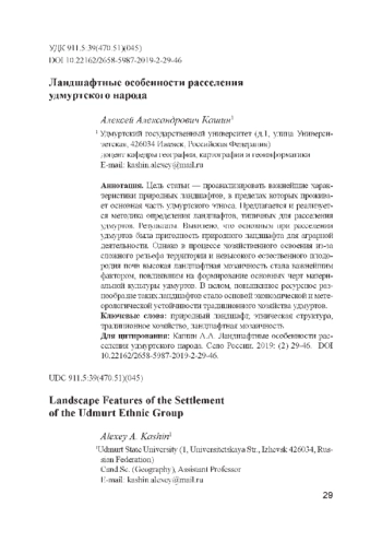 Цель статьи — проанализировать важнейшие характеристики природных ландшафтов, в пределах которых проживает основная часть удмуртского этноса. Предлагается и реализуется методика определения ландшафтов, типичных для расселения удмуртов. Результаты. Выявлено, что основным при расселении удмуртов была пригодность природного ландшафта для аграрной деятельности. Однако в процессе хозяйственного освоения из-за сложного рельефа территории и невысокого естественного плодородия почв высокая ландшафтная мозаичность стала важнейшим фактором, повлиявшим на формирование основных черт материальной культуры удмуртов. В целом, повышенное ресурсное разнообразие таких ландшафтов стало основой экономической и метеорологической устойчивости традиционного хозяйства удмуртов.
