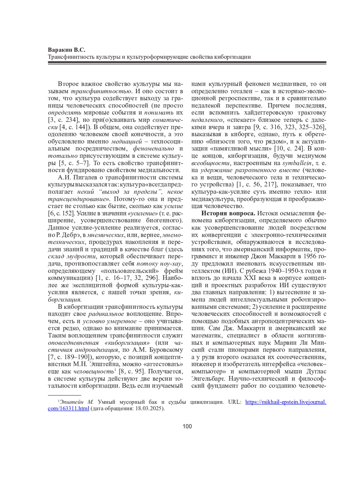 22. Варакин В.С. Трансфинитность культуры и культуроформирующие свойства киборгизации.