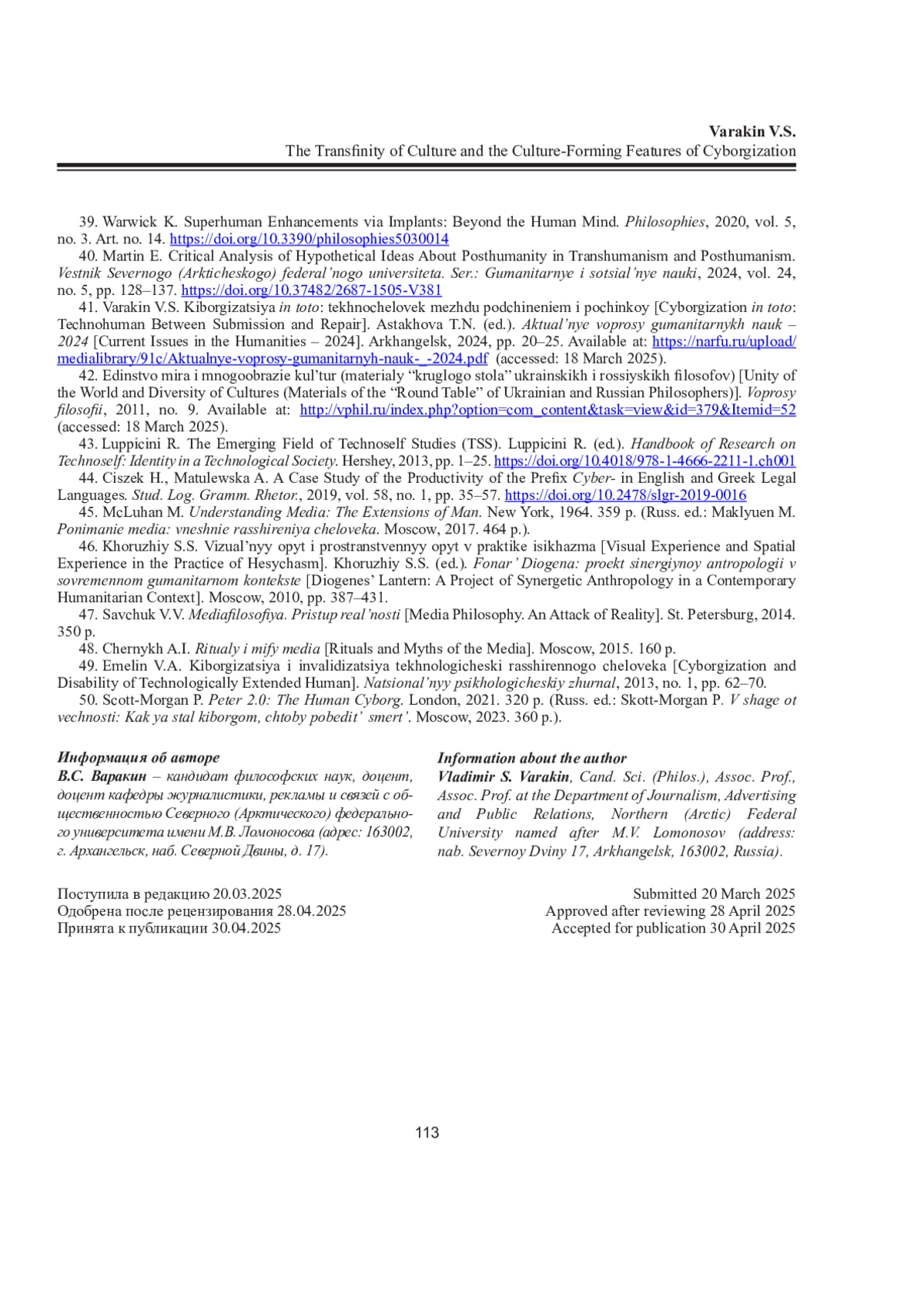 45. Varakin V.S. The Transfinity of Culture and the Culture-Forming Features of Cyborgization.