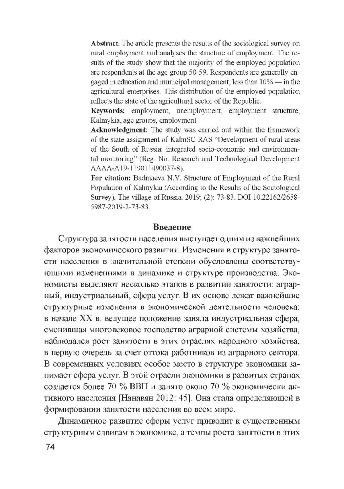 В статье представлены результаты социологического опроса по проблеме занятости сельского населения, проанализирована структура занятости. Результаты исследования показывают, что большую часть занятого населения составляют респонденты возрастной группы 50-59 лет. Респонденты в основном заняты в сфере образования и муниципального управления, менее 10% — в сельскохозяйственных предприятиях. Такое распределение занятого населения отражает состояние аграрного сектора республики.
