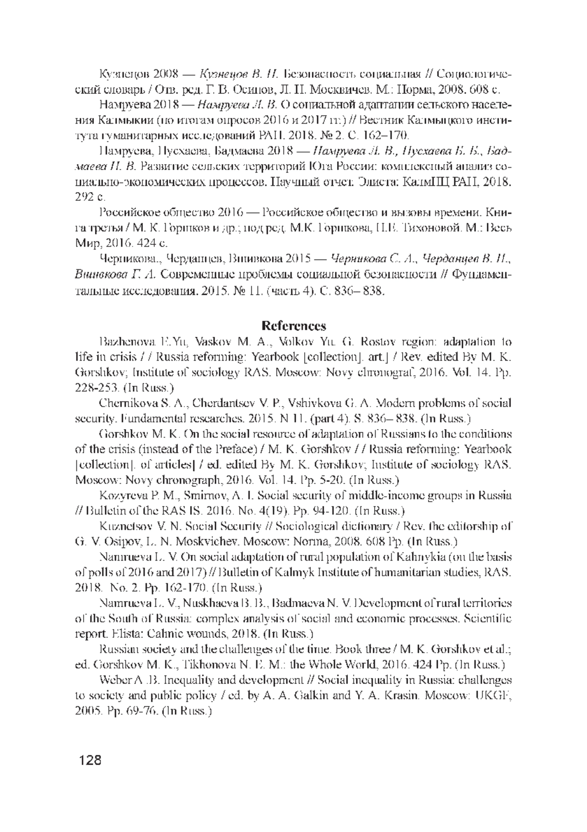 7. Намруева Л. В., Нусхаева Б. Б., Бадмаева Н. В. Развитие сельских территорий Юга России: комплексный анализ социально-экономических процессов. Научный отчет. Элиста: КалмНЦ РАН, 2018. 292 с.