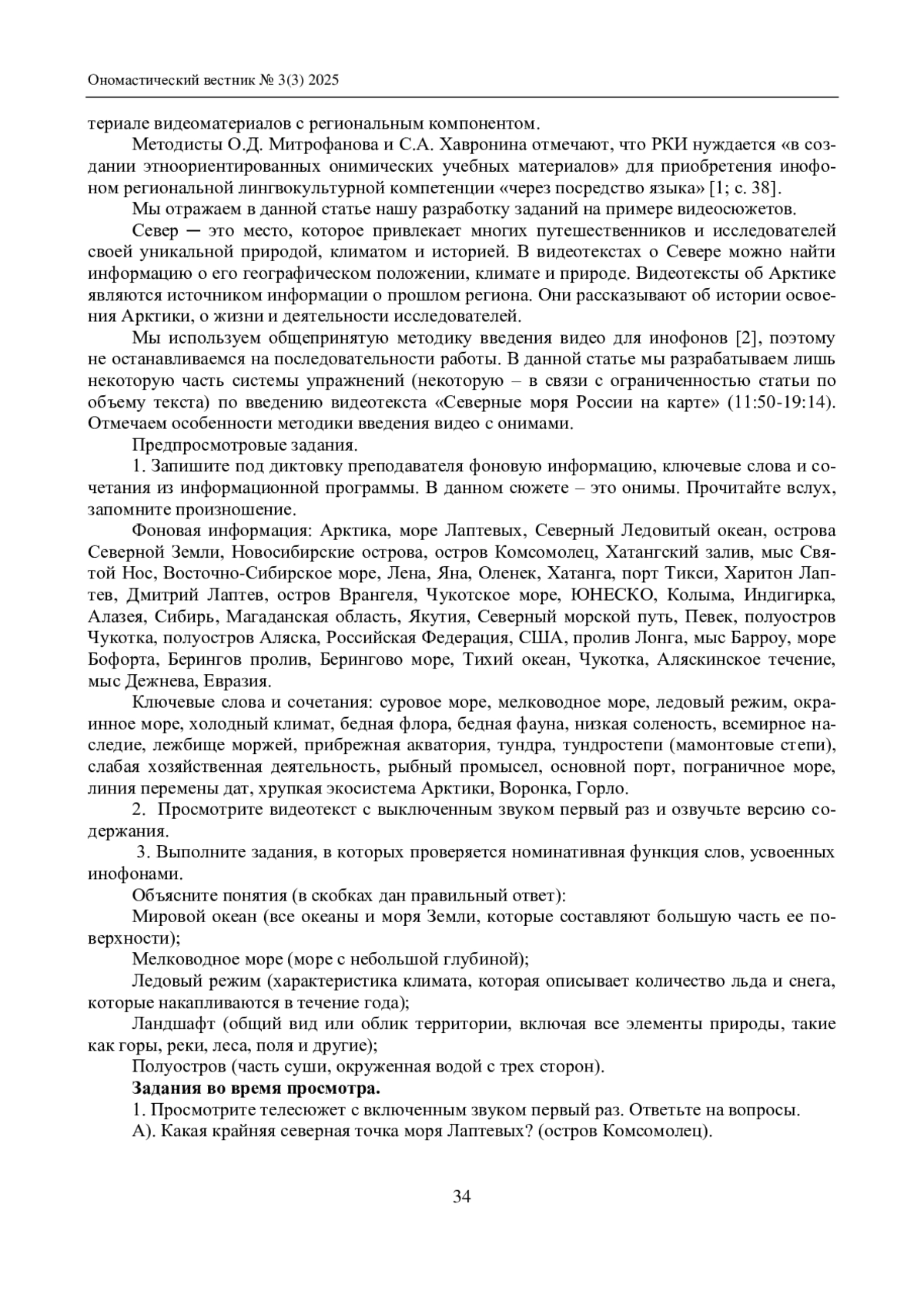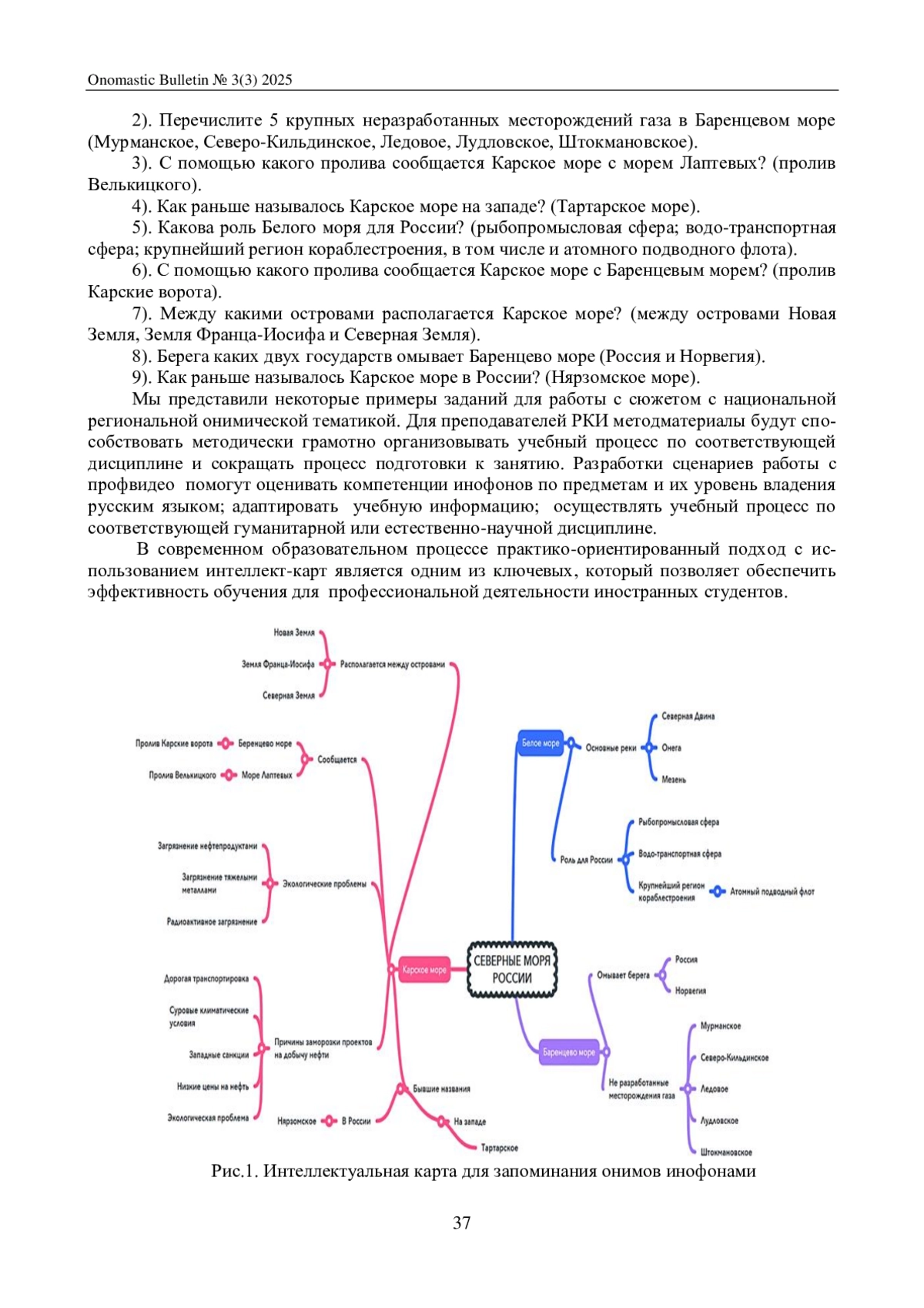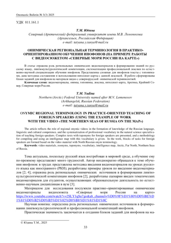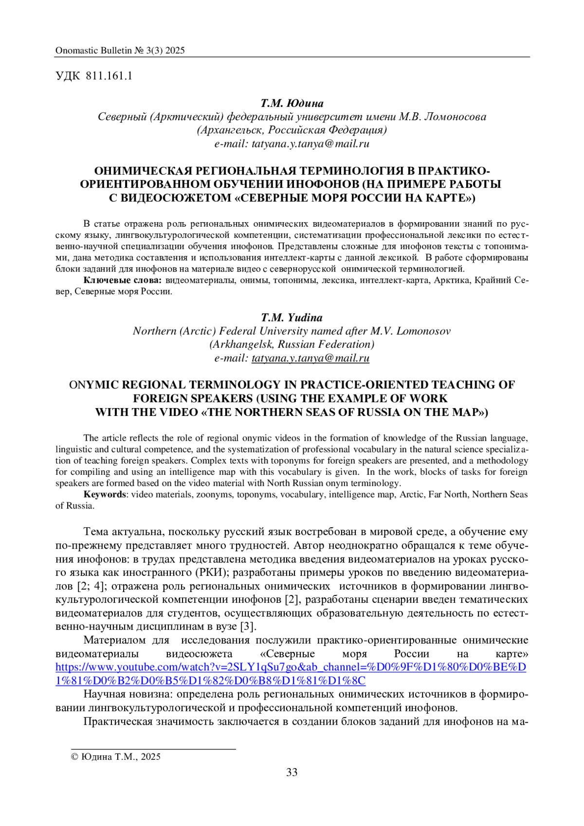 В статье отражена роль региональных онимических видеоматериалов в формировании знаний по русскому языку, лингвокультурологической компетенции, систематизации профессиональной лексики по естественно-научной специализации обучения инофонов. Представлены сложные для инофонов тексты с топонимами, дана методика составления и использования интеллект-карты с данной лексикой. В работе сформированы блоки заданий для инофонов на материале видео с севернорусской онимической терминологией.