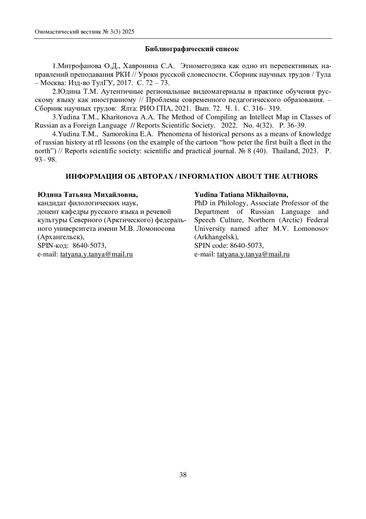 4. Yudina T.M., Samorokina E.A. Phenomena of historical persons as a means of knowledge of russian history at rfl lessons (on the example of the cartoon “how peter the first built a fleet in the north”) // Reports scientific society: scientific and practical journal. No 8 (40). Thailand, 2023. P. 93- 98.