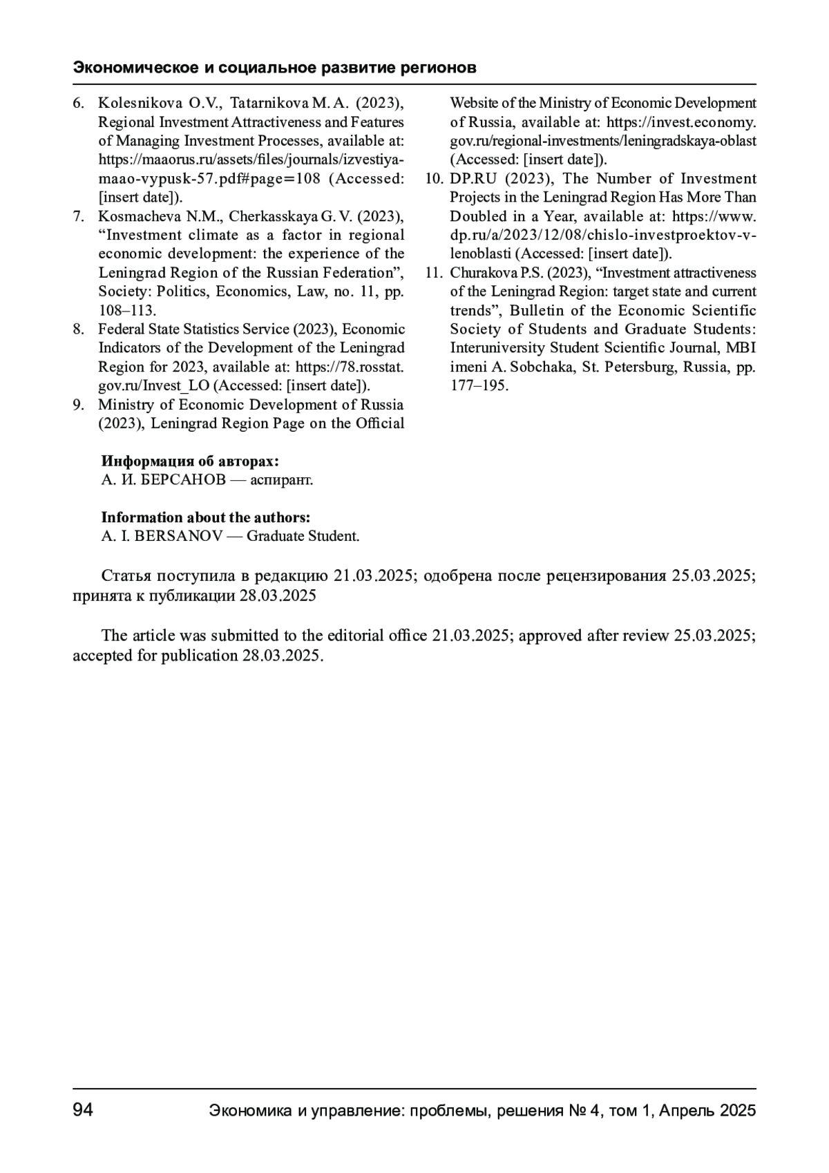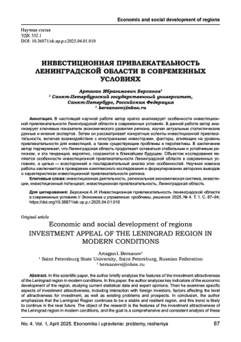 БЕРСАНОВ А. И. ИНВЕСТИЦИОННАЯ ПРИВЛЕКАТЕЛЬНОСТЬ ЛЕНИНГРАДСКОЙ ОБЛАСТИ В СОВРЕМЕННЫХ УСЛОВИЯХ // ЭКОНОМИКА И УПРАВЛЕНИЕ: ПРОБЛЕМЫ, РЕШЕНИЯ. 2025. ТОМ 1 № 4