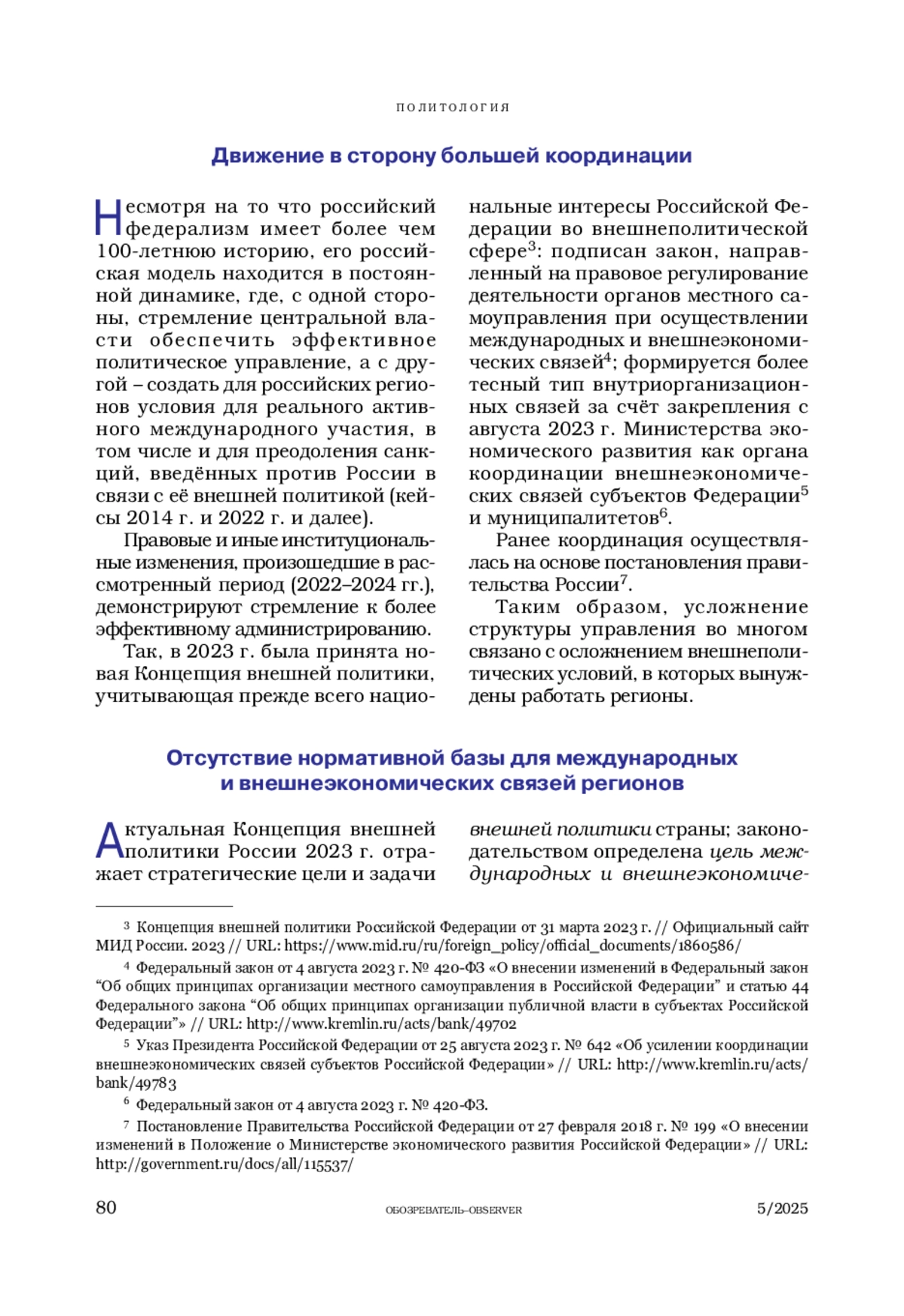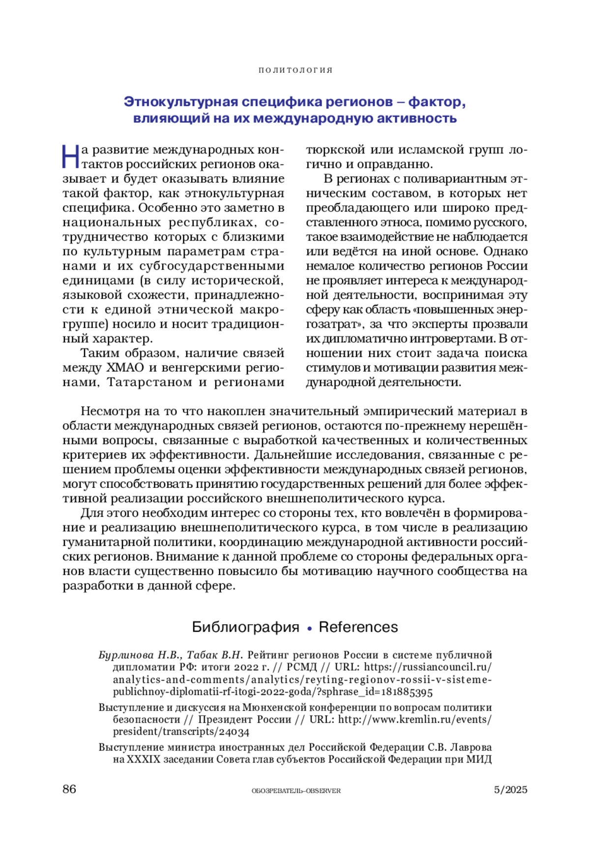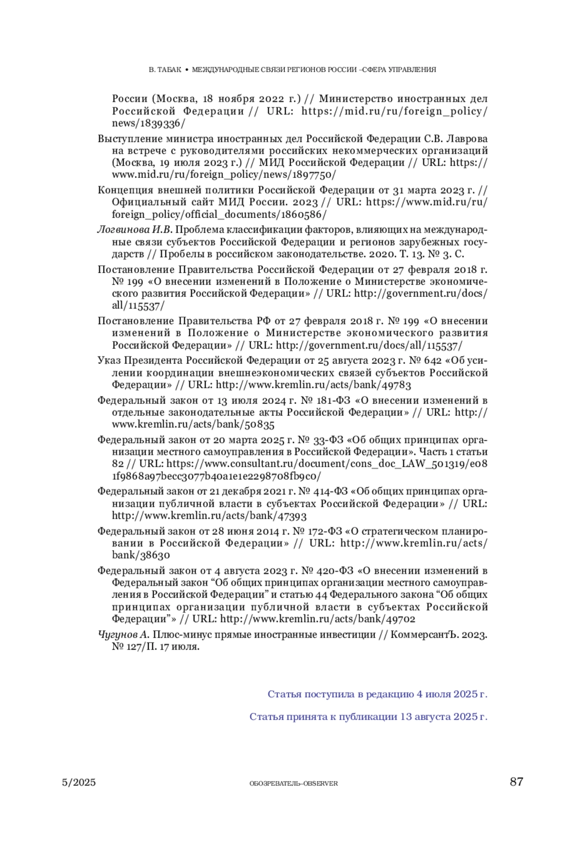 ТАБАК В. Н. МЕЖДУНАРОДНЫЕ СВЯЗИ РЕГИОНОВ РОССИИ – СФЕРА УПРАВЛЕНИЯ. ОБЩИЕ ТЕНДЕНЦИИ (2022–2024 ГГ.) // ОБОЗРЕВАТЕЛЬ. 2025. № 5