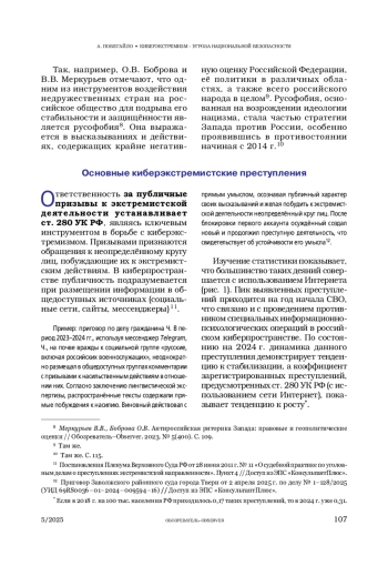 Киберэкстремизм – одна из ключевых угроз национальной безопасности России. На основе статистических данных и материалов правоприменительной практики исследуются тенденции и особенности данного вида преступности. Предлагаются пути совершенствования мер противодействия, включая профилактическую работу и внедрение современных технологий.