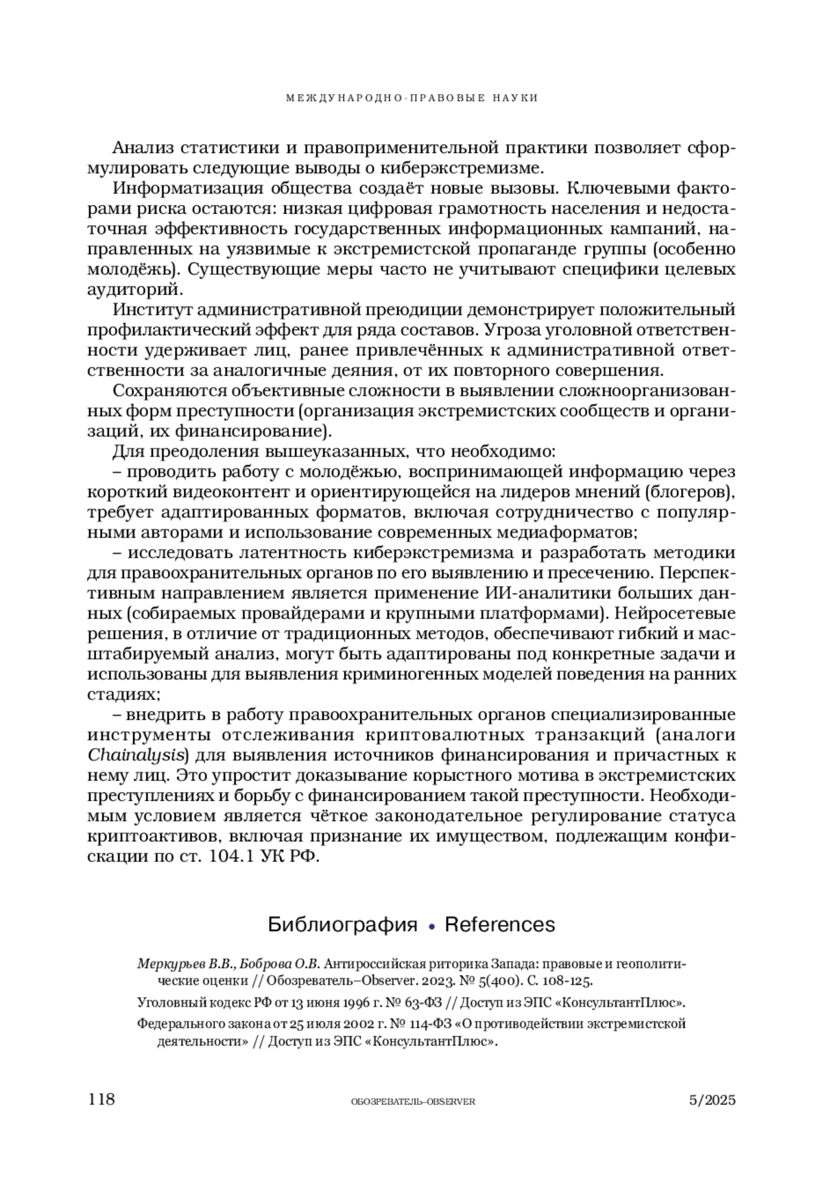 1. Меркурьев В.В., Боброва О.В. Антироссийская риторика Запада: правовые и геополитические оценки // Обозреватель-Observer. 2023. № 5(400). С. 108-125.