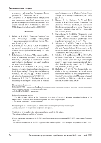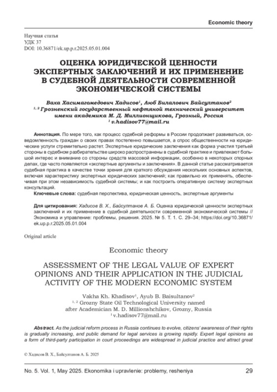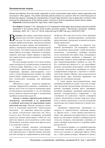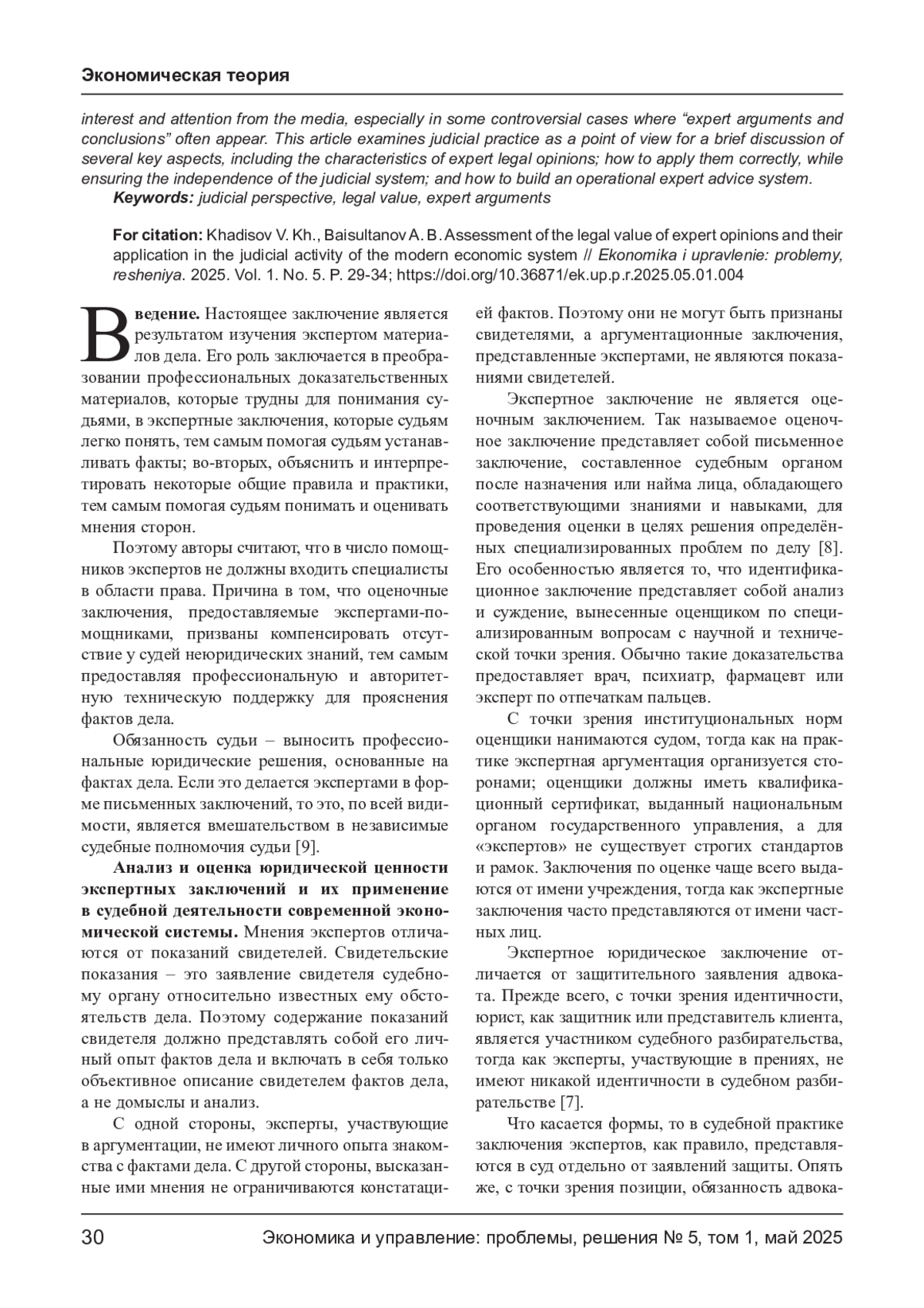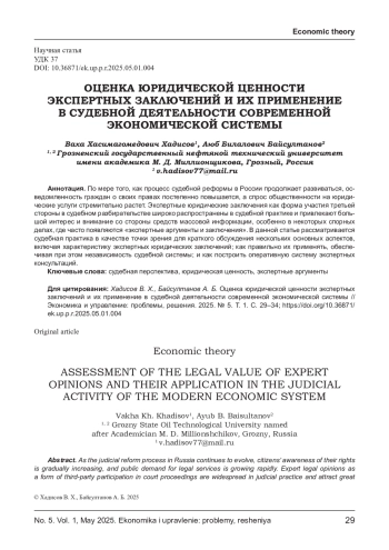 ХАДИСОВ В. Х., БАЙСУЛТАНОВ А. Б. ОЦЕНКА ЮРИДИЧЕСКОЙ ЦЕННОСТИ ЭКСПЕРТНЫХ ЗАКЛЮЧЕНИЙ И ИХ ПРИМЕНЕНИЕ В СУДЕБНОЙ ДЕЯТЕЛЬНОСТИ СОВРЕМЕННОЙ ЭКОНОМИЧЕСКОЙ СИСТЕМЫ // ЭКОНОМИКА И УПРАВЛЕНИЕ: ПРОБЛЕМЫ, РЕШЕНИЯ. 2025. ТОМ 1 № 5