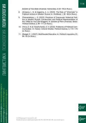 8. Ульмаева Л. Н., Гагарина А. А. Роль «неформалов» в политических акциях в современной России // PolitBook. 2024. №1. С. 30-48.