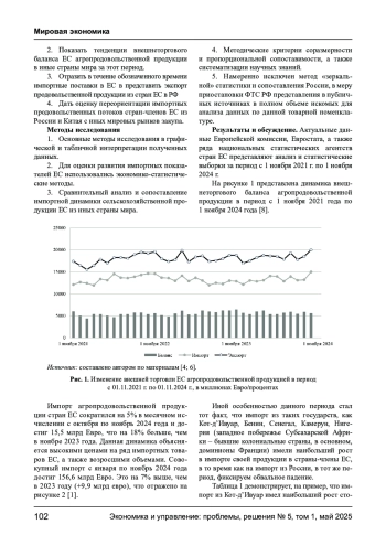 В ходе анализа представлены разнонаправленные динамики импортной деятельность стран-членов ЕС, в период с 1 квартала 2022 по 1 квартал 2025 года, относительно иных государств мира. Определены агроимпортные товарные группы, которые фиксируют рост или падение. Обозначено, как изменился «агроимпортный ландшафт» стран партнеров ЕС в мире, что способствовало смене лидеров за этот период и какие меры предпринял ЕС для переориентации своих импортных агропродовольственных товарных потоков с иных континентов или географических ареалов внешнеторгового закупа. Автором представлено, за счет каких мер удалось перенастроить смену импортного курса с рынков закупа классических партнеров (например, России) на новые государства (ранее не входившие в топ основных партнеров экспортеров на европейский рынок потребления продовольственной продукции). Анализ демонстрирует, какие товарные группы остались незыблемы и показали существенный рост в торговом балансе с классическими странами, ранее основными партнёрами ЕС. Фокус исследования акцентирован на период экономических ограничений ЕС в отношении России, прямой формы геополитических противоречий в черноморском регионе как доноре сельскохозяйственного сырья на мировые рынки, а также фиксирует важные снисходящие экспортные тренды с Китаем и динамичный внешнеторговый рост с рядом государств западной Африки (Нигерия, Кот-д`Вуар и др.).