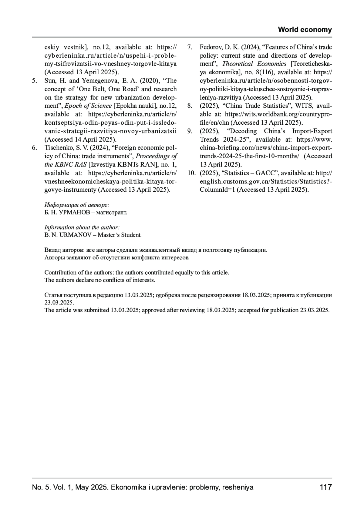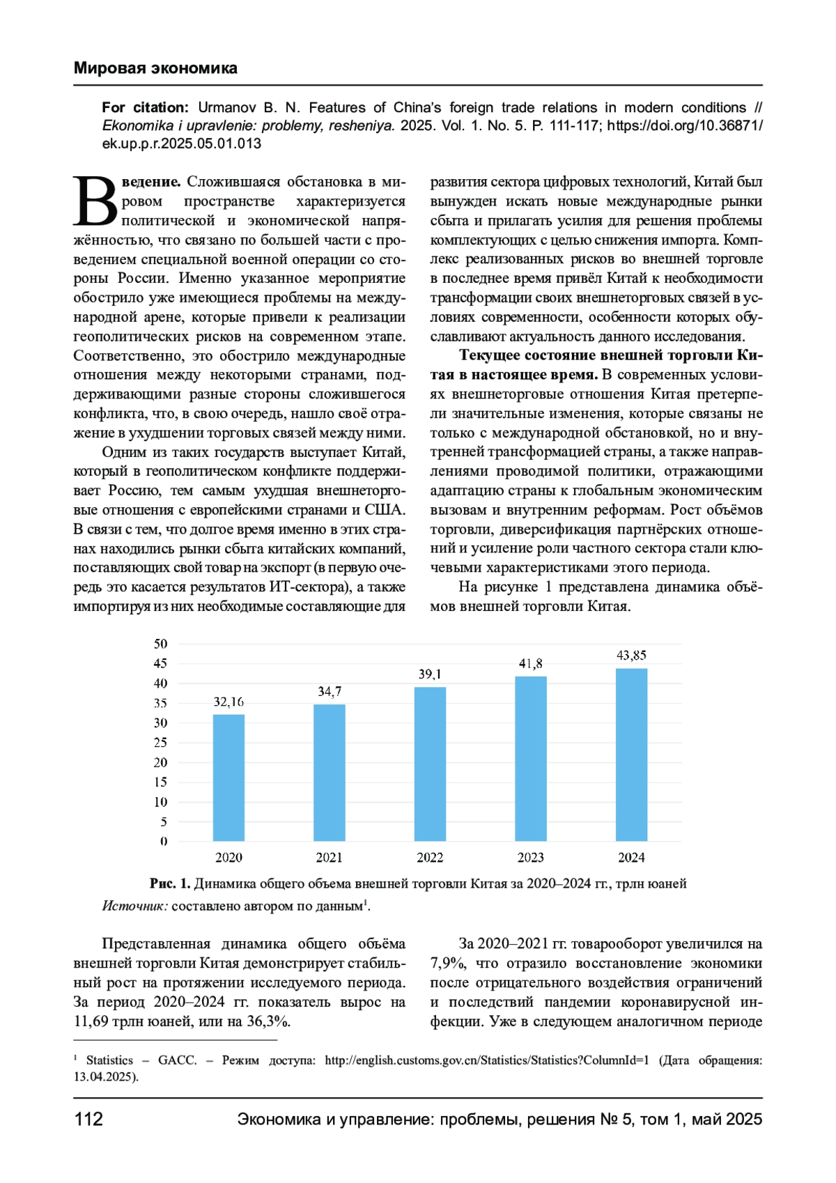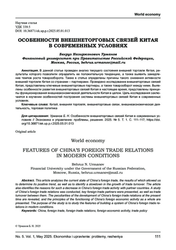 УРМАНОВ Б. Н. ОСОБЕННОСТИ ВНЕШНЕТОРГОВЫХ СВЯЗЕЙ КИТАЯ В СОВРЕМЕННЫХ УСЛОВИЯХ // ЭКОНОМИКА И УПРАВЛЕНИЕ: ПРОБЛЕМЫ, РЕШЕНИЯ. 2025. ТОМ 1 № 5