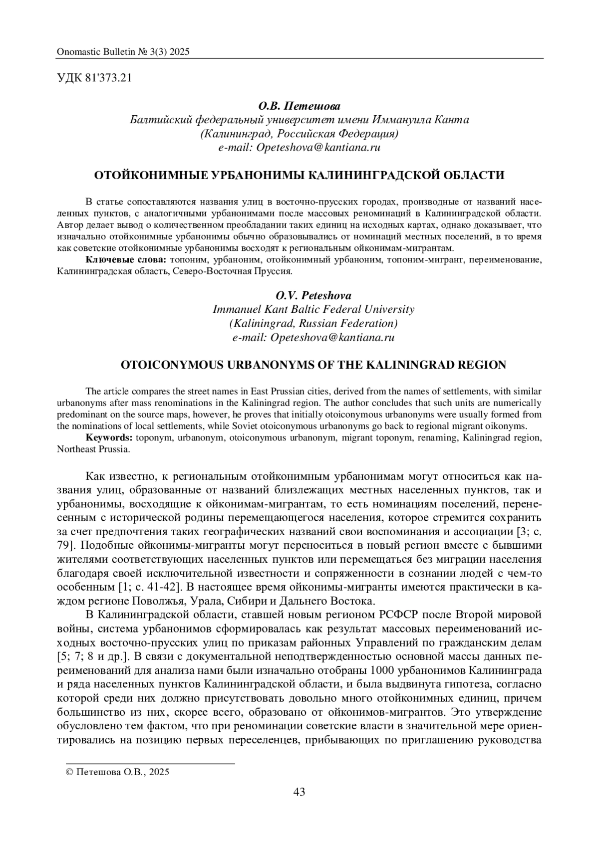 6. Петешова О.В. Роль дистантной топонимической метонимии в Калининградской области // Lingua Academica: Актуальные проблемы лингвистики и лингводидактики. Ульяновск: Ульяновский государственный университет, 2024. С. 124-129.