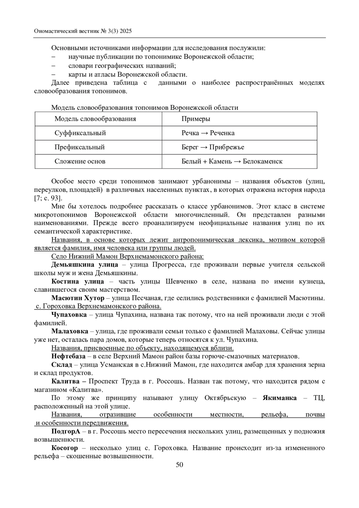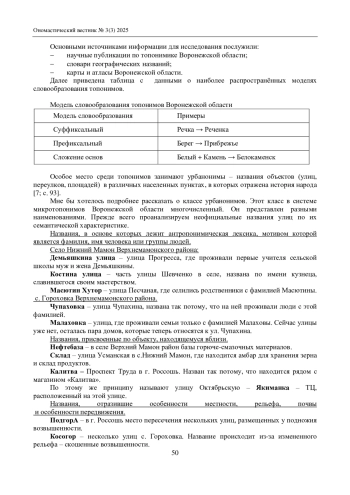 Цель настоящей статьи – изучение официальных и неофициальных микротопонимов, составляющих специфическую часть лексики Воронежской области. Топонимы – это особые лингвистические единицы, и поэтому, безусловно, их должна изучать лингвистика. Микротопонимы – один из видов топонимов, название небольшого местного объекта. В ходе исследования была выявлена специфика использования микротопонимов в Верхнемамонском и Россошанском районах. В ходе сопоставительного анализа на качественном уровне проведена корреляция между уровнями топонимизации и классификацией геоморфологических объектов, определены критерии микротопонимов. В настоящее время значительное внимание уделяется изучению локальных особенностей языка, которые отражают уникальные культурные и исторические аспекты определенных регионов. Особую ценность в этом контексте представляют микротопонимы, которые являются важным элементом лингвистического ландшафта и культурного наследия региона. Воронежская область, богатая своими историческими и культурными традициями, обладает уникальным микротопонимическим материалом, изучение которого может дать новые знания не только в области лингвистики, но и в методике преподавания русского языка.