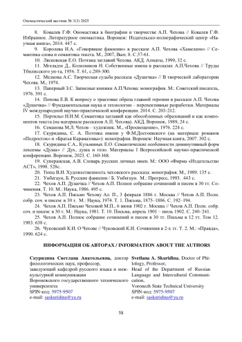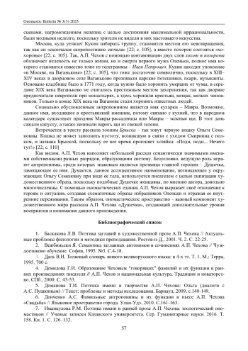 7. Иманкулова Р.М. Поэтика имени в ранней прозе А.П. Чехова: зоологический ономастикон // Ученые записки Казанского университета. Сер. Гуманитарные науки. 2016. Т. 158. Кн. 1. С. 126-132.