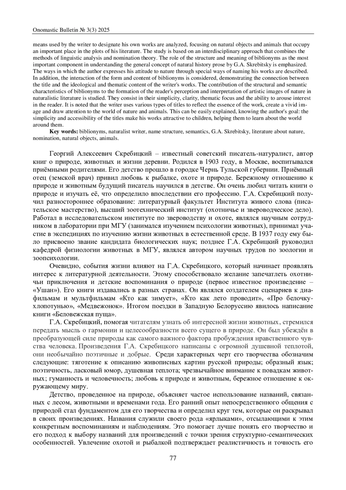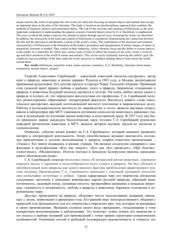 Аннотируемая статья посвящена исследованию структурно-семантических особенностей библионимов писателя-натуралиста Г. А. Скребицкого. Рассматривается специфика названия книг и рассказов Г. А. Скребицкого, определяющая ключевое направление развития его творческой деятельности. Анализируются композиционные приемы и выразительные средства, используемые писателем для обозначения собственных произведений, акцентируя внимание на природных объектах и животных, занимающих важное место в сюжетах его лите-ратуры. Исследование основывается на междисциплинарном подходе, сочетающем методы лингвистического анализа и теории номинации. Подчеркивается роль структуры и значения библионимов как важнейшего компонента в понимании общей концепции природоведческой прозы Г. А. Скребицкого. Описываются пути выражения автором своего отношения к природе посредством особых способов называния своих произведений. Кроме того, рассматривается взаимодействие формы и содержания библионимов, демонстрируя связь между названием и идейно-тематическим содержанием произведений писателя. Исследуется вклад структурно-семантических характеристик библионимов в формирование читательского восприятия и интерпретации художественных образов природы в литературе натуралистического направления. Они заключаются в их простоте, ясности, тематической направленности и способности вызывать интерес у читателя. Отмечается, что писатель использует разнообразные типы названий, чтобы отразить суть произведения, создать яркий образ и привлечь внимание к миру природы и животных. Это легко объяснить, зная цель автора: простота и доступность названий делают его произведения привлекательными для детской аудитории, помогая им познавать окружающий мир.