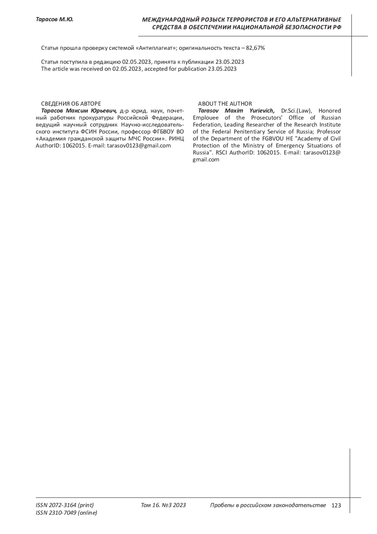 Information on the execution of the order of the Prosecutor General of the Russian Federation dated May 17, 2018 No. 295 “On the organization of prosecutorial supervision over the implementation of laws on countering terrorism”, prepared within the competence of the Main Directorate for International Legal Cooperation, January 2023 // Archive of the Main Directorate of International -legal cooperation of the Prosecutor General’s Office of the Russian Federation. 2023.
