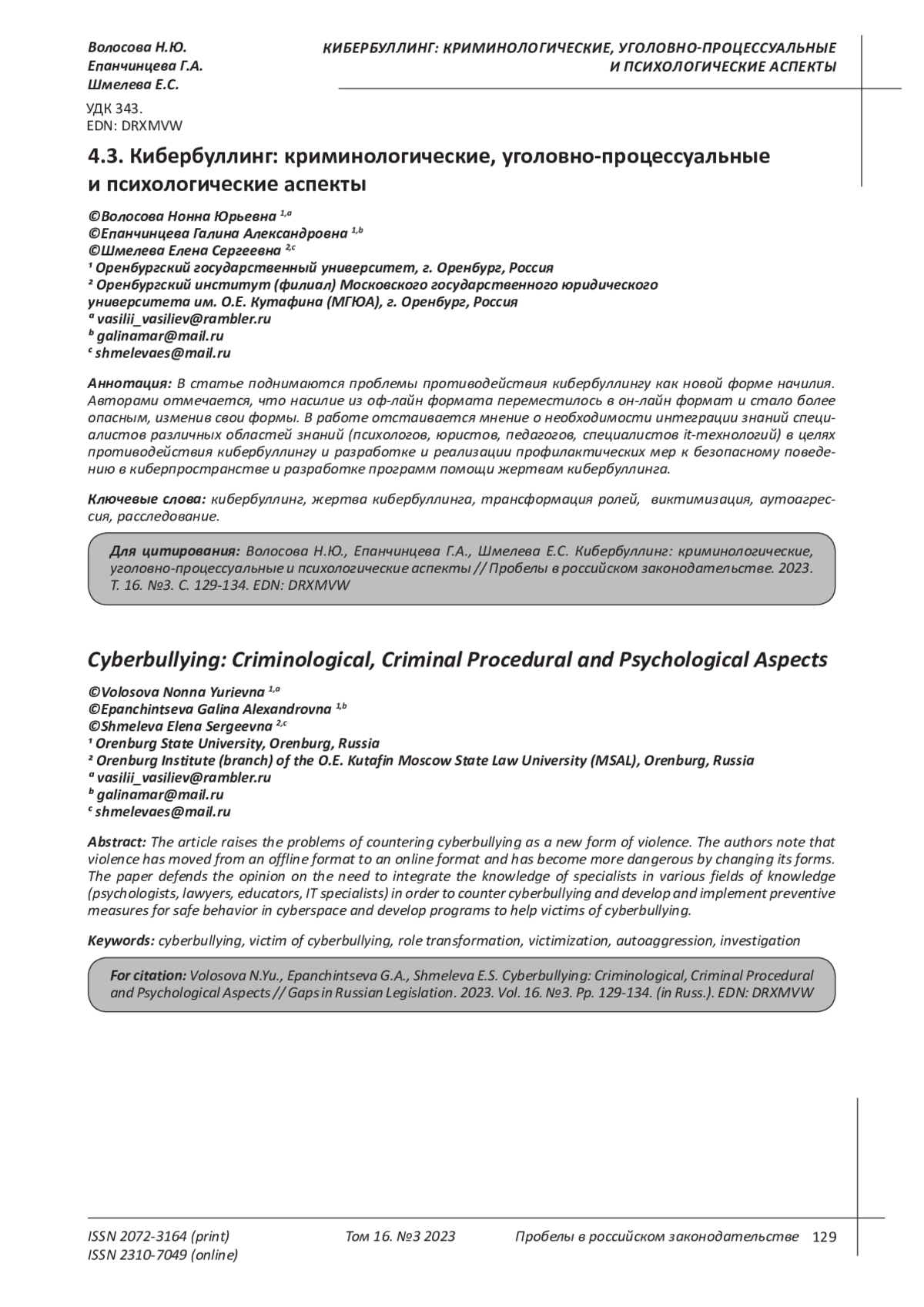 Zabelin S.E. The phenomenon of cyberbullying in the modern world / S.E. Zabelin // Substantive and procedural aspects of modern education: materials of the IV International Scientific and Practical Conference / Ed.-comp. I.A. Romanovskaya, E.A. Tarabanovskaya. - Astrakhan, 2022. - pp. 254-256. EDN: YBAUZC