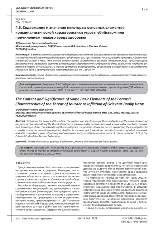 В рамках статьи раскрыто содержание и значение для расследования основных элементов криминалистической характеристики угрозы убийством или причинением тяжкого вреда здоровью. Сделан обоснованный вывод о том, что знание особенностей исследуемого состава позволяет лицу, производящему расследование, правильно оценить сложившуюся следственную ситуацию по делу, выдвинуть наиболее вероятные версии случившегося, а также грамотно спланировать, объективно и всесторонне расследовать уголовные дела о преступлениях, предусмотренных ст. 119 УК РФ.
